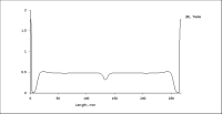 Mangels besseren Wissens habe ich das ganze folgendermaßen simuliert: Die Magneten sind Neodym-Magneten mit den Maßen 40x10x5 mm, in zwei Reihen und jeweils sechs übereinander, so dass eine Magnetreihe die Gesamtmaße 240x10x10 mm hat. Mittig ist ein 3 mm breiter Spalt, der durch die lokale Abschwächung des Magnetfelds die Grundmode des Bändchens weniger anregen soll. Der Eisenträger besteht aus "US Steel Type 2-S 0.018 inch thickness", was auch immer das heissen soll. An den Enden ist jeweils ein 1 cm tiefer Einschnitt, in der das Bändchen befestigt werden kann. Die Tiefe der Simulation beträgt 10 mm.