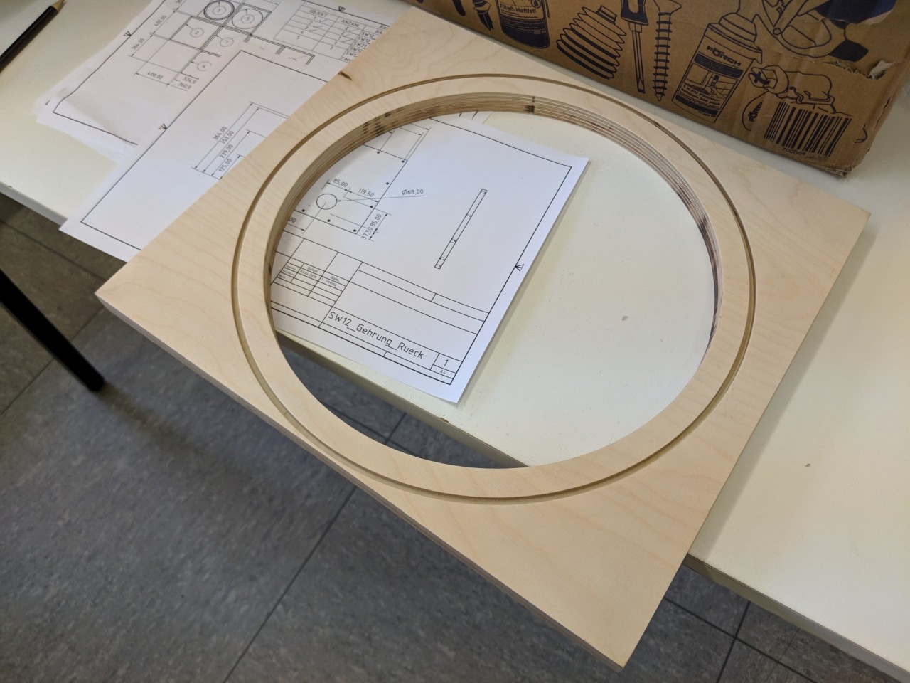 Leider hat auch der Korb des Chassis außen einen überstehenden Rand – dadurch ist ein Rückseitiger Einbau nicht eben einfach zu bewerkstelligen. Naja – muss man eben einen zusätzlichen Ring fräsen. Gesagt – getan. Damit das Gitter dann nicht übersteht, hab ich die Front einfach aufgedoppelt.