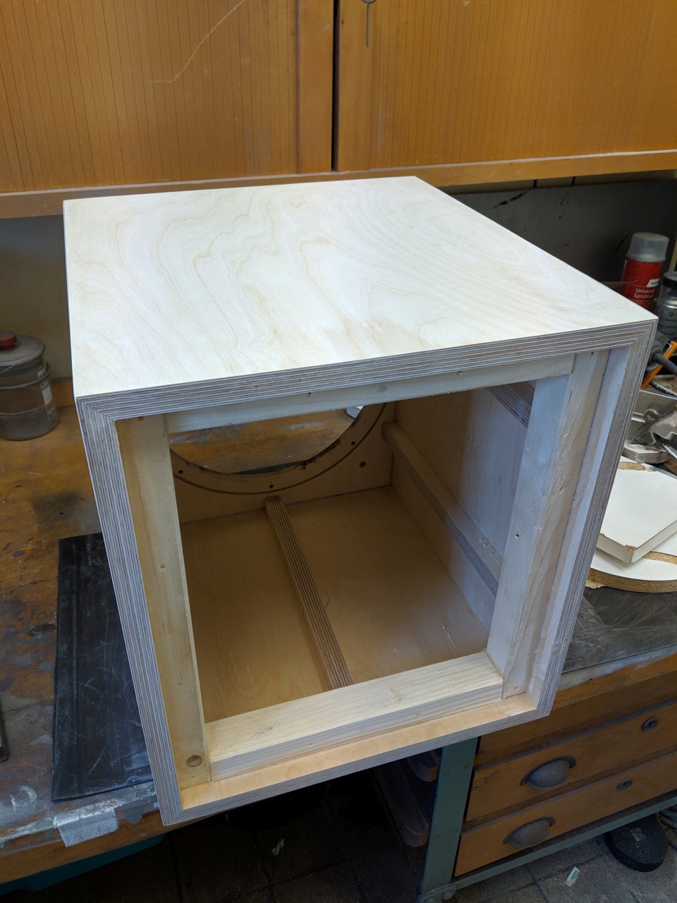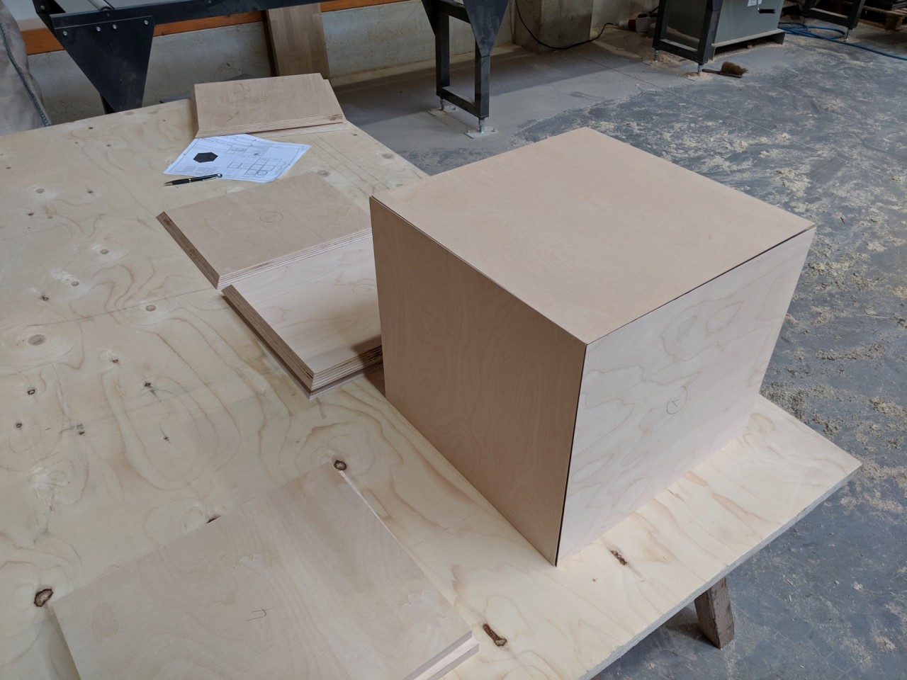 Als nächstes habe ich mir dann Gedanken zu den Gehäusedimensionen gemacht. Da gibt es ja verschiedene Ansichten (Auslegung nach dem „goldenen Schnitt“ etc…). Ich denke im Subwooferbetrieb ist das weniger relevant als beim TMT / MT aber es beruhigt das Gewissen. Ich habe mich letztendlich nach dem Lesen dieses Threads https://www.diy-hifi-forum.eu/forum/...l=1#post247686 hier im Forum für ein Verhältnis von 1:0,95:0,9 entschieden. Das erzeugt eine hohe Modendichte, diese sind aber weniger ausgeprägt. Das erforderliche Volumen ist ja mehr oder weniger durch die Simulation gesetzt. Hinzu kommt noch die Verdrängung des Chassis sowie von den Verstrebungen. Ich hab jetzt mal ca. 4 Liter für das Chassis & 3 Liter für Verstrebungen etc. gerechnet. Bei Außenabmessungen von BxTxH 360x400x400 mm erreiche ich Brutto ca. 324x346x364 mm was ungefähr dem angestrebten Verhältnis von 1:0,95:0,9 entspricht. Das macht rund 40,8 Liter abzüglich 7 Liter >> also Netto 33,8 Liter. Auf den letzten Liter kommt´s da auch nicht an…