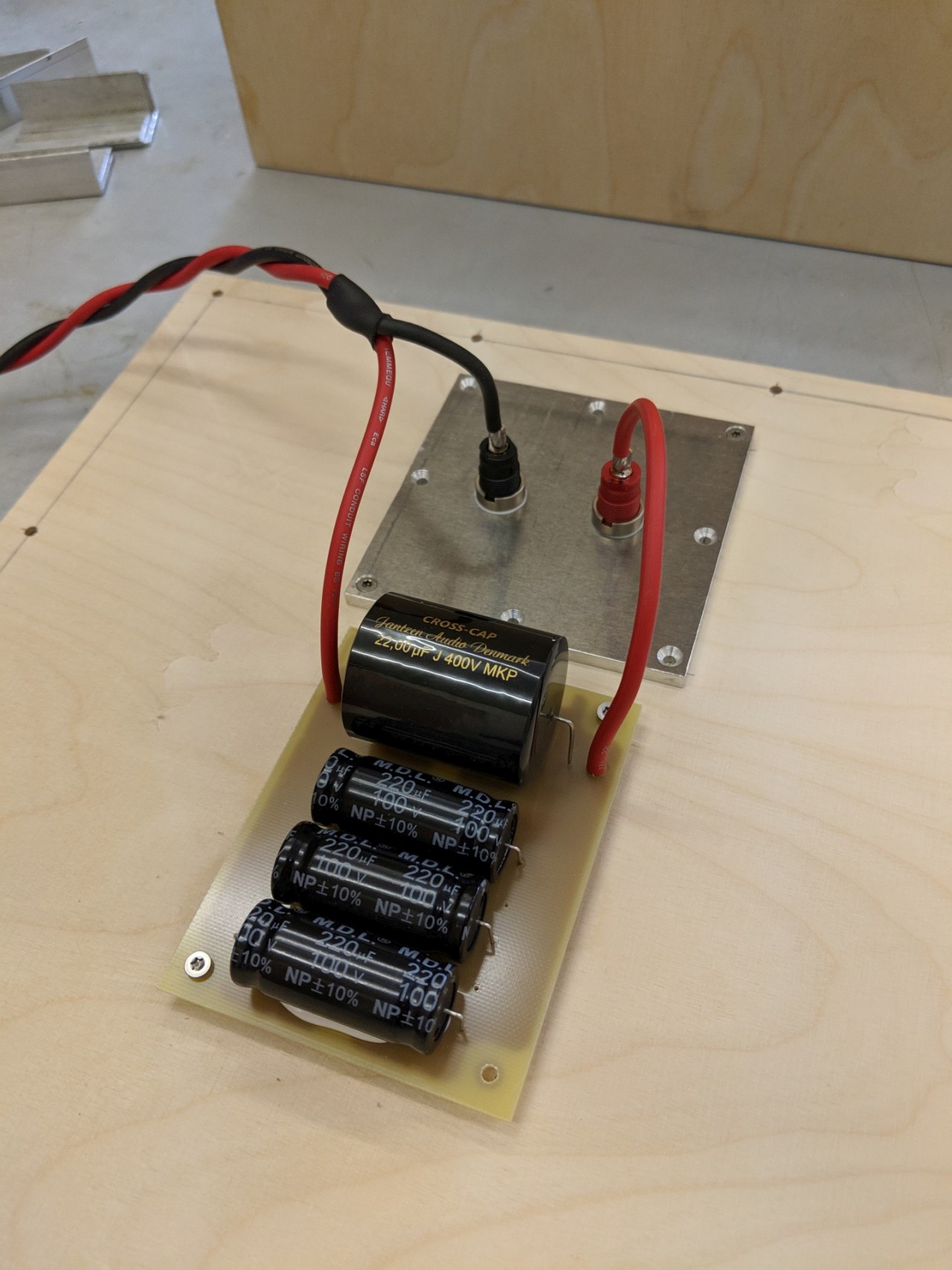 Wenn man im Web nach GHP sucht – lautet die Empfehlung meist eine Güte von 0,9 – 1 anzustreben und dann den Frequenzgang mit dem Kondensator wieder gerade zu biegen. Das entspricht beim SW12HEX rund 25 Liter. Das passt für Subwoofer aber wohl nur bedingt. Ich gönne dem Lautsprecher ein wenig mehr Luft und spendiere ihm rund 34 Liter Netto. Das bringt nochmal ein paar Hz mehr Tiefgang. Als Hochpass-Kondensator schalte ich 3 x 220 uF Elcaps sowie einen MKT-Cross Cap mit 22 uF parallel. Rechnerisch also 682 uF. Gemessen mit nem Fluke 117 DMM sind es sogar rund 745 uF.