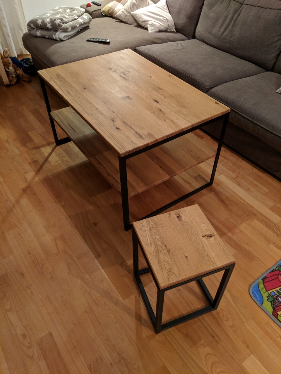 Entschieden habe ich mich für das schwarze Wachs. In Kombination mit einer massiven Wildeiche Leimholz Platte dürfte das ganz cool aussehen. Diese hab ich noch von meinen selbstgebauten Couch Tischen übrig. Das Design ist also angelehnt an die vorhandenen Tische: