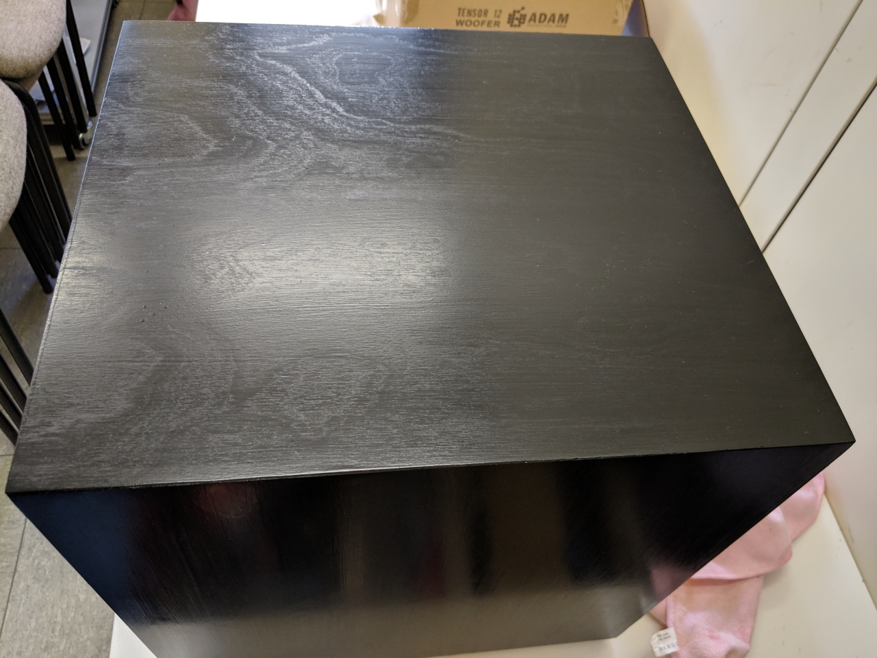 Beide Subs sind nun geölt / gewachst / lackiert wie auch immer. Ich habe mich allerdings von der Methode mit dem Tuch verabschiedet. Das Tuch saugt zu sehr, und das Ergebnis ist zu dünn... Laut Hersteller soll man das Dekorwachs mit einem Pinsel auftragen. Also hab ich das mal probiert. Der erste Eindruck war sehr ernüchternd. Zwar hatte ich nun ein tiefes schwarz, allerdings war anstatt der Holzmaserung nur der Pinselstrich zu sehen... Nach einer relativ langen Trocknungsphase sieht es aber in etwa so aus, wie ich mir das gewünscht hatte...