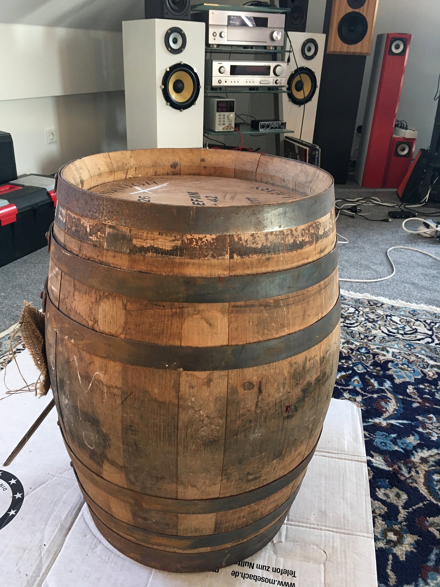 Wen es interessiert: Das ist ein Ex-Sherry-Fass in dem dann einer meiner Whiskys gereift ist. Eigentlich wollte ich das Fass nochmal mit anderem Sprit füllen aber meine Spritreserven reichen bis Lebensende, deshalb soll ein Lautsprecher draus gebaut werden.