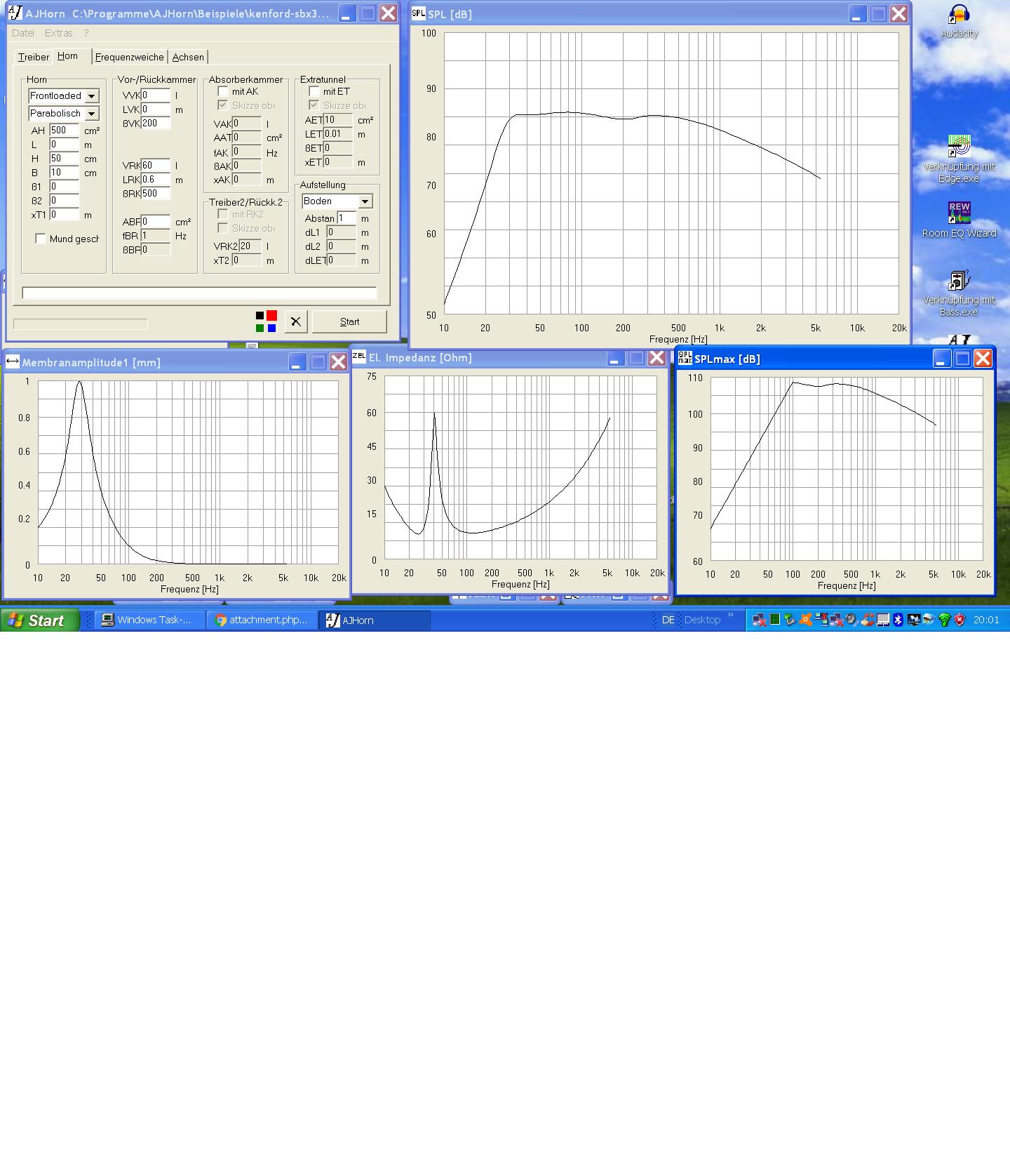 Als Bassreflex habe ich mit AJHorn nix sinnvolles simulieren können, als GHP mit 500uF schon eher. Wobei ich sagen muß, ich weiß nicht mehr, woher die TSP stammen und ob die korrekt sind.Anhang 56603Anhang 56604