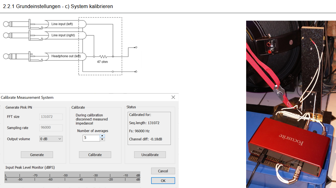 Ich bin bei der Bestimmung der TSP streng nach LIMP Handbuch vorgegangen. Verwendete Hard-/Software sind ARTA (Vollversion), Focusrite Scarlett 2i2 (3.Gen.), Steinberg UR22 MKII, PeakTech 3360, Voltcraft LPS1305, Voltcraft MT-52 (Nur noch als Thermo-/ Hygrometer, nachdem mir aufgefallen ist, dass das ein Mittelwert-Multimerter ist), alter HiFi-Verstärker (Onkyo Integra A-8850), Billige Feinwaage von Amazon mit Kalibriergewicht und Plastic-Fermit als Zusatzgewicht.