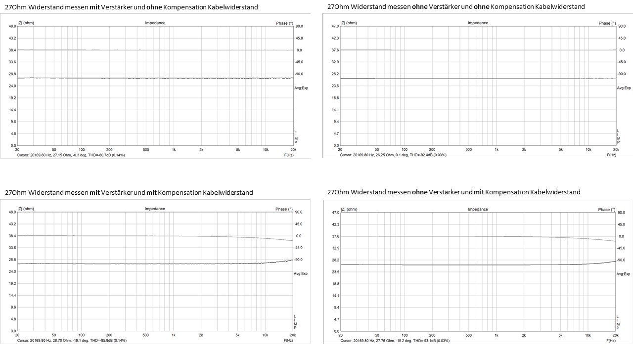 Gestern habe ich mein Messaufbau mit einem 27 Ohm Widerstand getestet. Scheint soweit alles zu funktionieren. Allerdings ist mir dabei aufgefallen, dass der Impedanzverlauf sich ändert, wenn man die Funktion "Kompensation der Messleitung" verwendet. Auch die Messung mit kurzgeschlossener Leitung sieht anders aus als im Handbuch. Dort ist die Phase aufsteigend, bei mir ist die abfallend bzw. Wannenförmig. Unabhängig davon, ob ich nur das Interface oder noch einen Verstärker benutze. Habe ich vielleicht doch irgendwo einen Fehler drin?