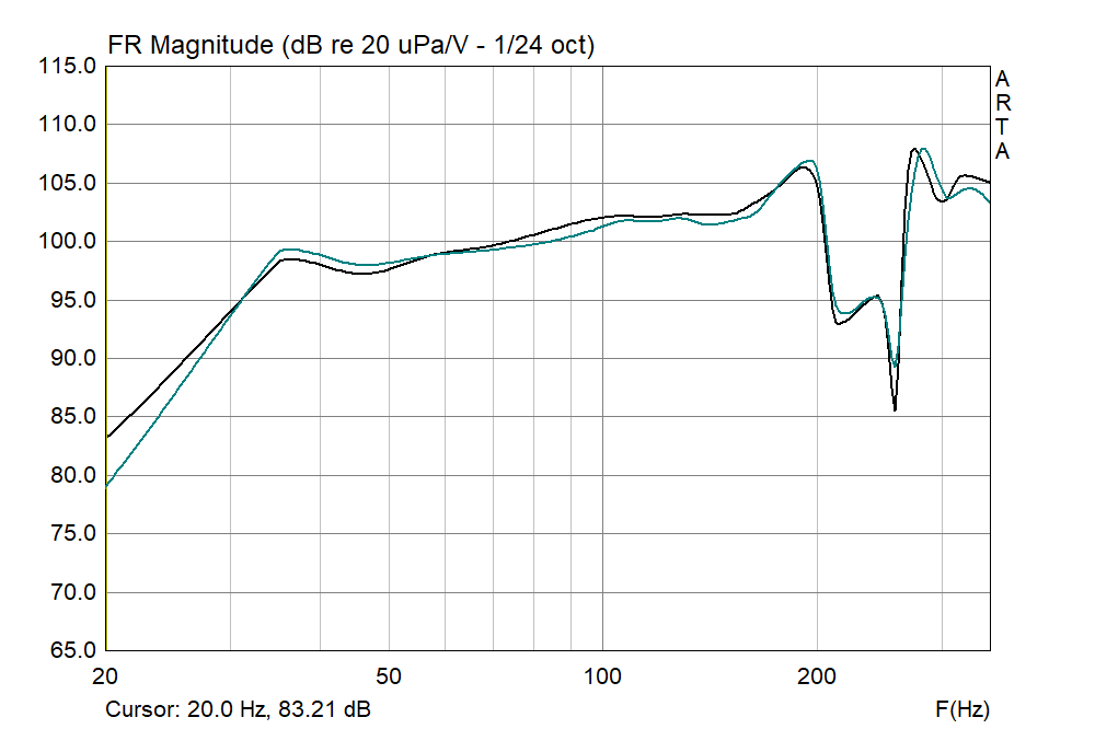 Wir sehen einen vernachlässigbaren Unterschied bei der Kleinsignalmessung. Bei der Grosssignalmessung fällt auf dass um das Tuning des Gehäuses, also dort wo der Resonator den Hub des Chassis bedämpft, beide auf einem Level spielen - bei Frequenzen direkt darüber, wo sich das Hubmaximum des Konstrukts befindet, das teildefekte Chassis bis zu 4 dB leiser.