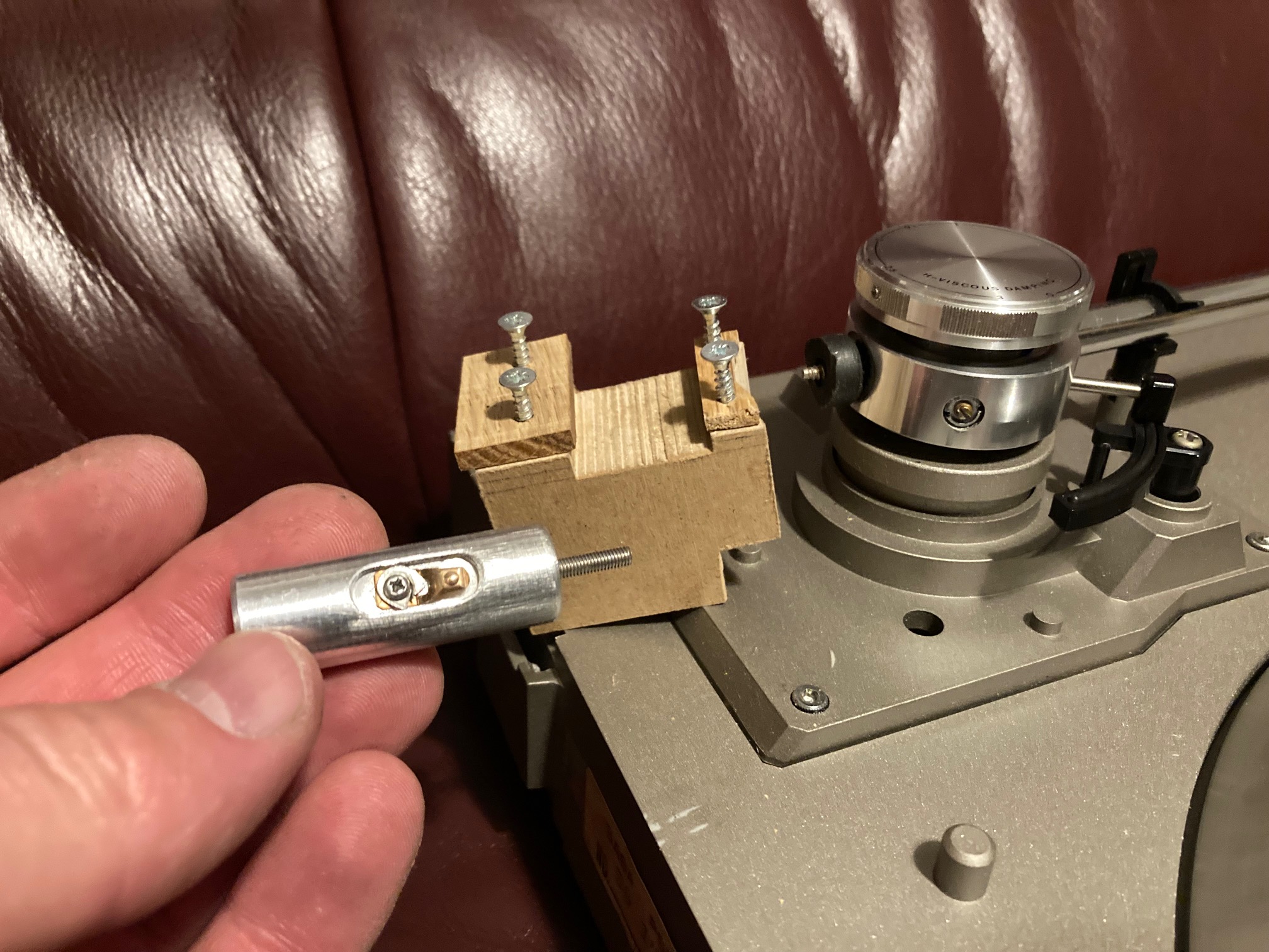 Für die Reparatur hatte ich die Idee, dass man ein Stück von einem Edelstahl-Gewindestab mit WIG anschweißen könnte. Dann ließe sich das Kontergewicht sogar mit einer Schraube festziehen oder lockern. Damit das einwandfrei funktioniert, musste aber eine Fixierung für die Schraube und den Gewindestab gebaut werden. Die Schraube am Tonarm ist nämlich lose gelagert und wird lediglich über eine Unterlegscheibe von innen geklemmt. Einfach festhalten und etwas aufschrauben? Niemals - das wird nichts. :rolleyes: