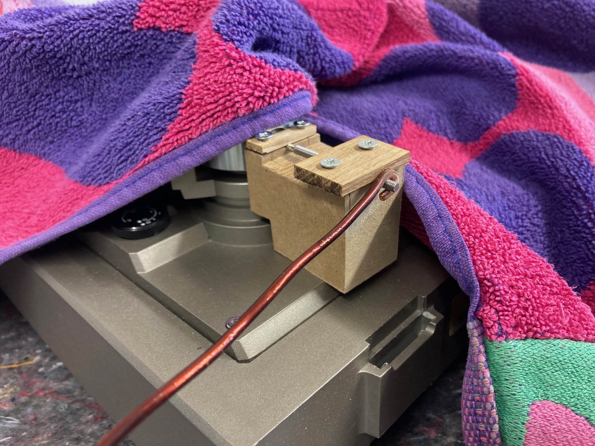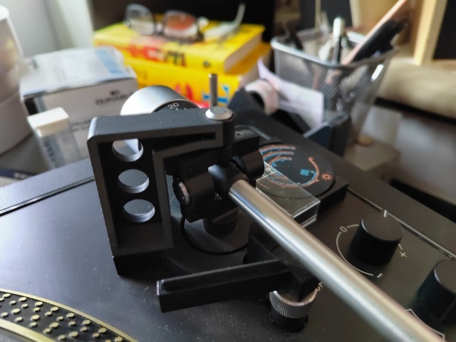 In den Halter habe ich also erstmal ein Langloch mit 2,5mm Kernlochdurchmesser gebohrt. Der vordere Teil Richtung Tonarm hat 3mm, sodass die erste Hälfte des Halters einfach aufgeschoben werden kann,