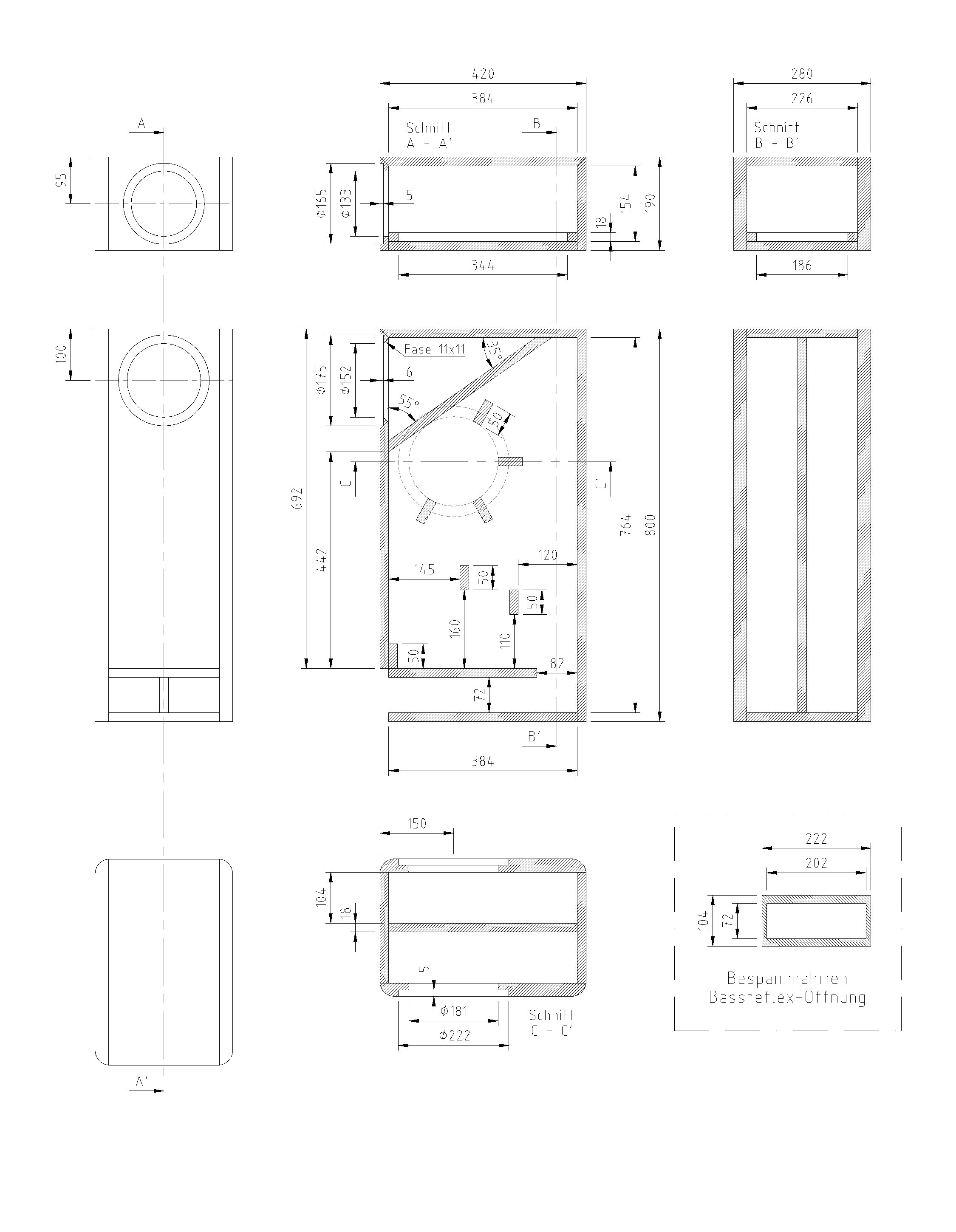 - Bassreflexkanal: Statt der auf Seite 35 des Heftes gezeigten Einlegebretter fertigst du vier Kreisabschnitte mit der Höhe des Bassreflexkanals die dann an die linke und rechte Seite des mittleren Trennbretts gelegt werden. Die Kreisabschnitte enden am Autritt des Kanals mit dem mittleren Trennbrett und dem Boden sowie am Eintritt des Kanals mit dem Deckel des Kanals. Die dickste Stelle des Kreisabschnitts engt den Kanal auf genau die Hälfte ein.