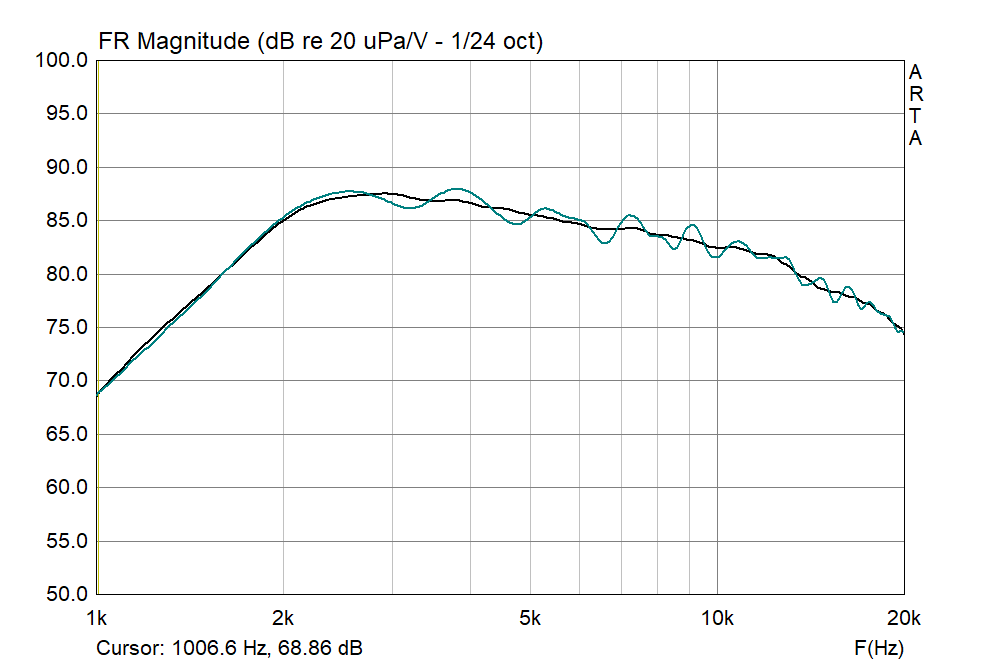 Darakon: hier eine Vergleichsmessung meines aktuellen Hochtöners im Waveguide türkis mit meinem alten, doch recht klobigen Gravity MS U CLMP, vs. schwarz den 3D gedruckten Halter; keine Glättung in Software:
