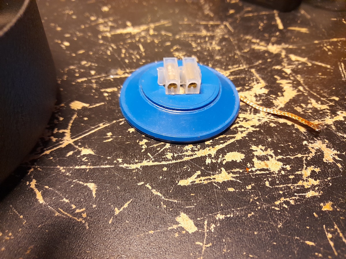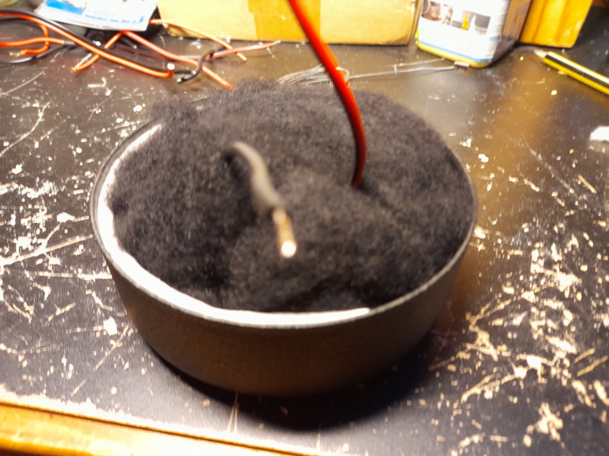 3. "Filzen": 2 Scheiben Filz mit je ca. 5mm Dicke eingelegt. Vorher natürlich noch die Kabel an die Terminals angelötet