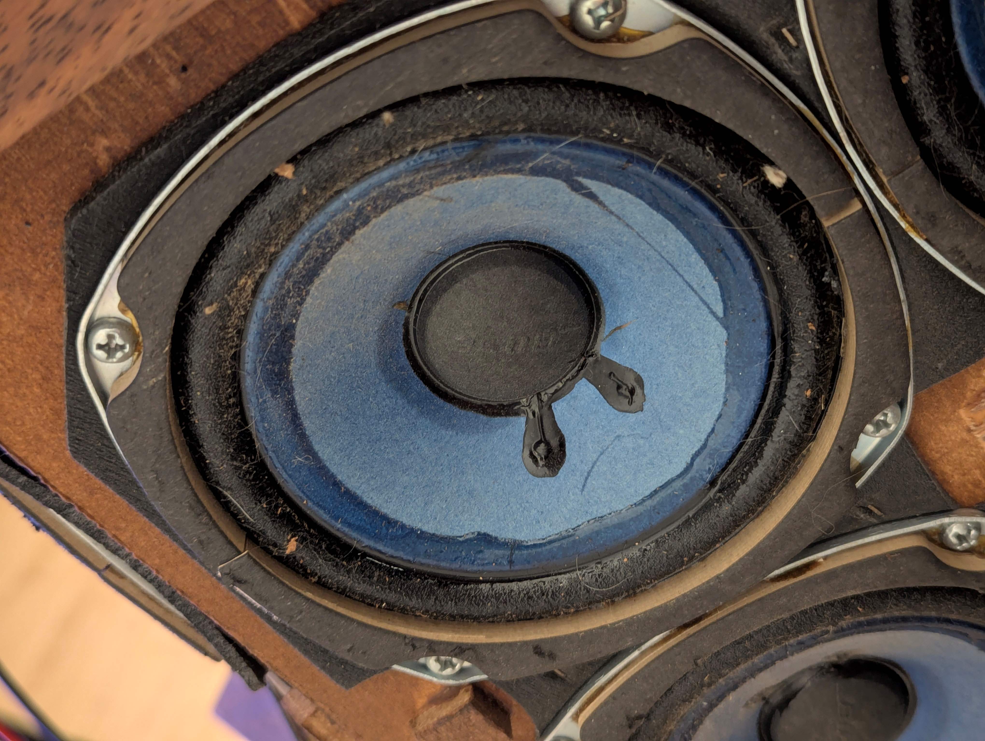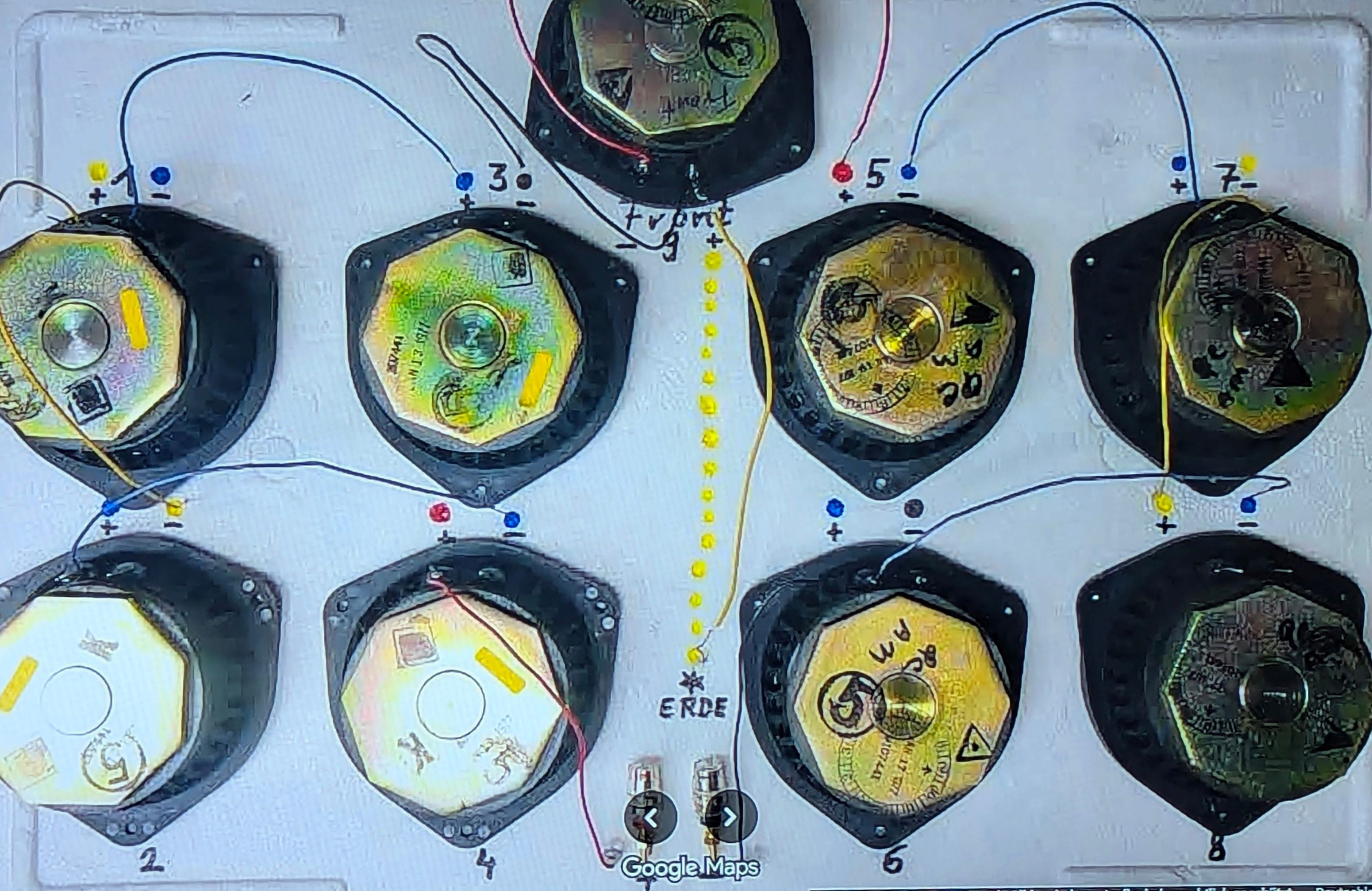 Auch bei der Verdrahtung der acht plus einem Chassis ging Herr Bose eigene Wege. Dem mitlesenden Highender stehen da doch die verbliebenen Haare zu Berge, odr? Alle neune sind mit Klingeldraht in Reihe verbunden. 9 x 0.9 Ohm. Hat den Vorteil, dass man merkt, wenn ein Chassis kaputt ist: die ganze Box bleibt stumm. Ob das bei allen Serien so gemacht wurde? Weiss das jemand?