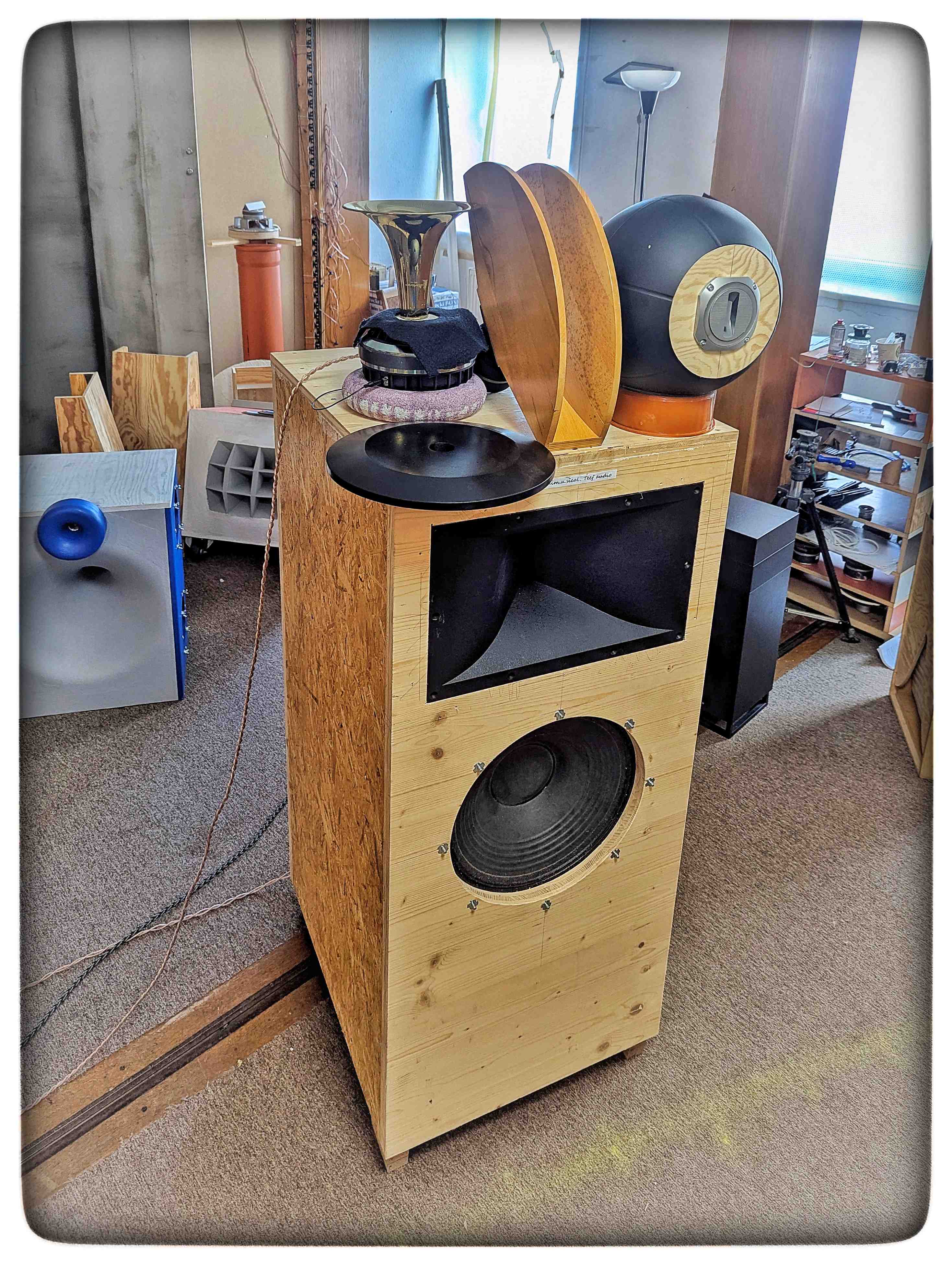 Rundum, hintenrum scheint zZ (siehe Dodekaeder) der Fokus meines Interesses zu sein. In und auf meinen Kühlschrank grossen Männerboxen sind drei Mitteltontreiber am Werk. Digital und räumlich möglichst zusammengerückt (Hörabstand 4 bis 9 Meter), versuchen sie, einen grossen gemeinsamen Abstrahlwinkel zu beschallen. 18"/15"/ 2"/2"/1"/ Beyma Schlitz. Die (nicht gebrauchte ) Hockersitzscheibe lässt den MT die Boxecke übersehen....