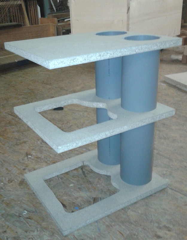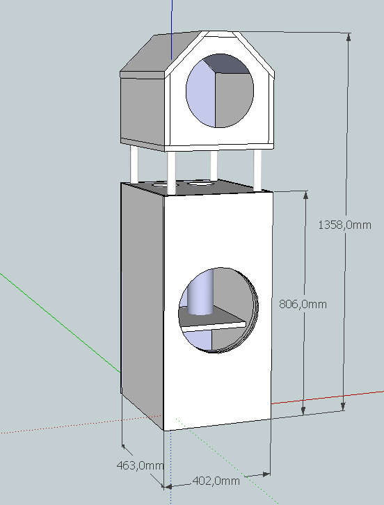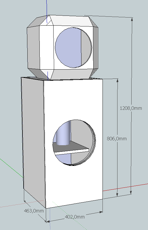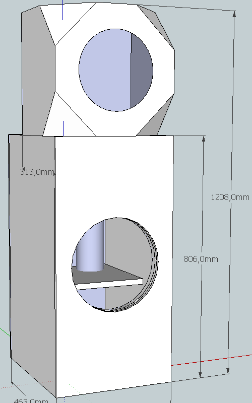 Die Stelzen sind da, damit ich die Ports auf die Oberseite der Tieftongehäuse bringen kann. Da ich keinen Knick in den Kanälen haben möchte, ist das bei den Gehäuseproportionen die einzige möglichkeit die 50 cm Portlänge unterzubringen. Ich könnte hochstens noch die Ports durch die MHT-Gehäuse durchführen, aber dann muss ich auch wieder verhindern, dass der Mittelton durch das HT-Rohr durch kommt... wieder mehr Aufwand. Zudem wollte ich die beiden Teile gerne Trennbar haben, alleine aus Gründen der Handhabbarkeit. Das wird auch so schon sperrig und schwer genug.