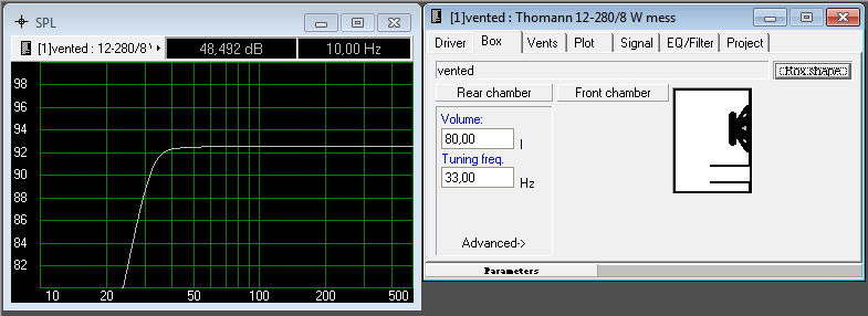 Basstreiber: Der SPA-12PA Braucht eher so 130 Liter um einen ähnlichen Frequenzgang wie der 12-280/8 W zu produzieren, und ist dann auch nur 1 dB lauter und 2 Hz tiefer. Der Mivoc würde in 80 l nochmal 2 Hz tiefer spielen, braucht aber doppelt so viel Leistung. Ist mir auch zu weich Aufgehängt, das gibt Wummerbass...