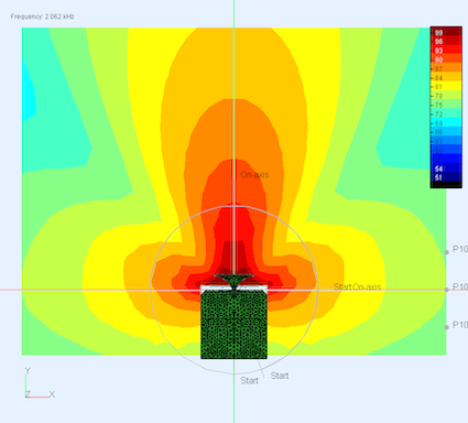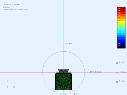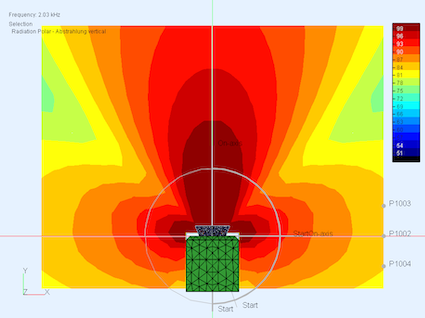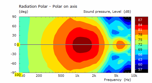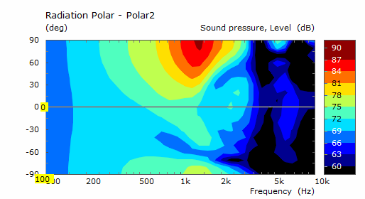 Die Peaks in der axialen Abstrahlung bei ca 6,5kHz, 12 kHz und 15kHz zeigen konstruktive Interferenzen der durch die Diffraktion an der Kegeloberkante entstehen (die 'Keulenbildung'). Das gilt hier für die 1m-Entfernung, bei anderen Entfernungen verschiebe sich die Peaks / Dips entpsrechend. Das eingefügte Beispiel zeigt hier die ABstrahlung beispielhaft bei 10 kHz (Wellenlänge ca 3,4 cm). In diesem Frequenzbereich erwarte ich mögliche Verbesserungen durch das Abrunden der Kegelkante, um die Diffraktion etwas abzuschwächen.