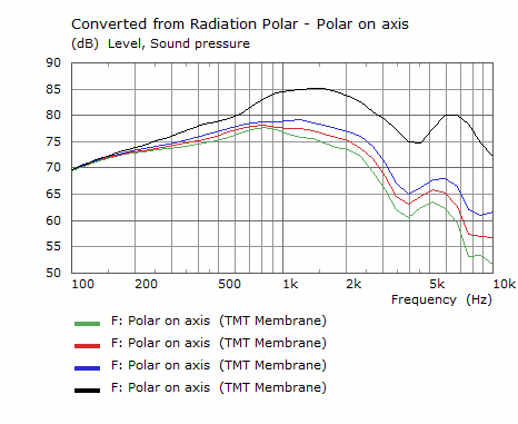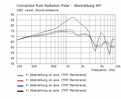 Der Frequenzgang des TMT bei 90° (rot) +/-10° blau und grün, siehe Messungen von Heinrich) und auf Achse (schwarz):