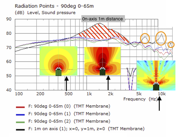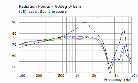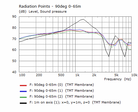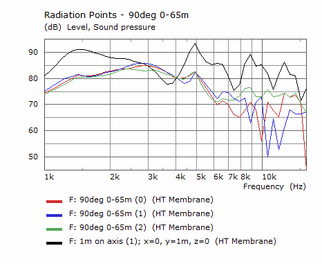 Die Frequenzbereiche, die das besonders stark betrifft, sind in der Abbildung mit den Frequenzgängen axial (Obacht, Entferung hier 1m) und 90° +/-10° (Entfernung hier 0.65m) gut zu sehen. Deshalb hatte ich in den FR-Abbildungen immer die axiale Abstrahlung mitgeführt. Die Differenz ist eigentlich größer, als in der Abbildung zu sehen, da die simulierte Entfernung axial größer ist (1m vs 0,65m bei 90°), aber in der Abbildung kam das halt so näher zusammen, ohne dass ich da nochmal eingreifen/korrigieren musste. Wie auch immer, das Prinzip ist gut zu erkennen:
