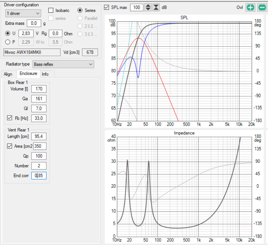 Der Strassacker-Rechner spuckt für fs=32, Vas280, Qts0.36 und zwei Rohre á 350cm² tatsächlich exakt 65cm Länge aus allerdingt bei 186l. Muss ich wohl zuhause mal Vituix anwerfen um es incl. der Korrekturfaktoren zu berechnen. Dann auch nochmal das Platzangebot prüfen und vielleicht klärt sich das auch mal die Geometrie.