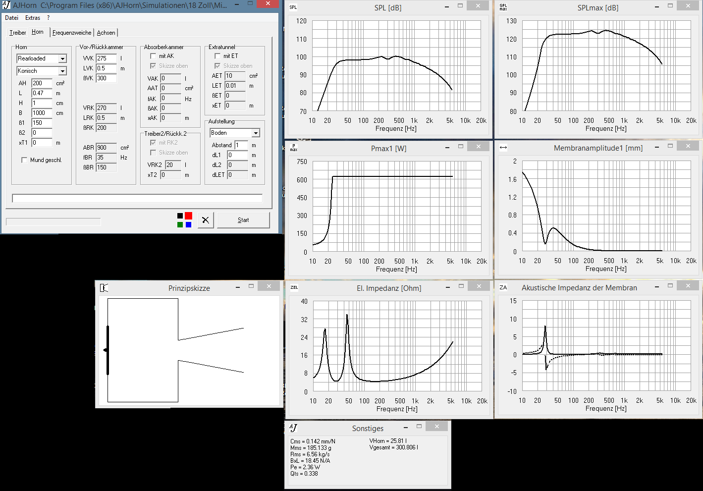 Rechne ich falsch oder lässt sich mit Hornreflex das Onken-Problem der langen BR-Kanäle lösen? Denn wenn ich die volle Frontöffnung mit Sd als Querschnitt ansetze, komme ich natürlich auf unendliche Portlängen, durch die Hornkontur wird es aber handhabbar, das bewegt sich exakt im gesuchten Bereich nämlich knapp der Gehäusetiefe.
