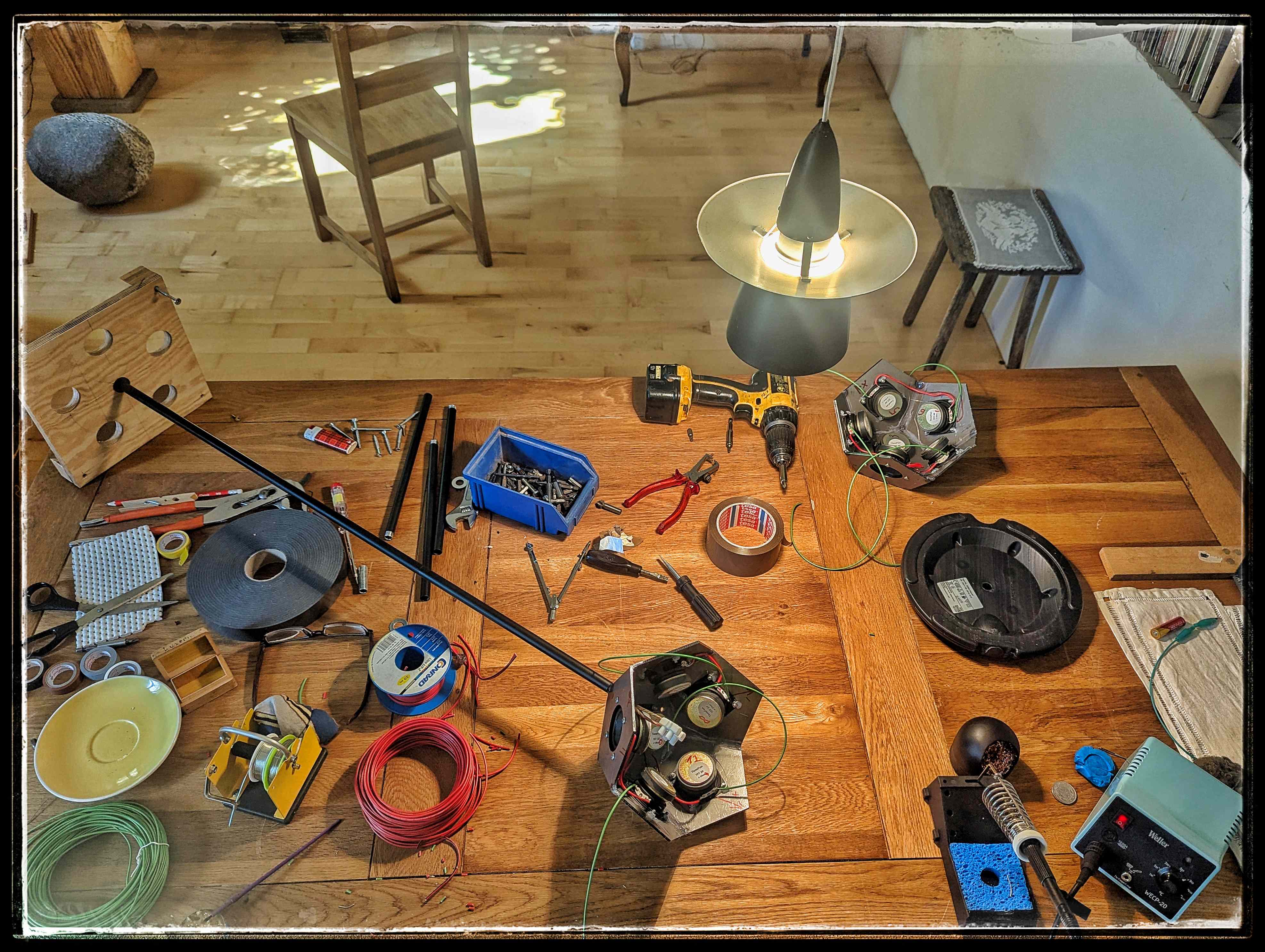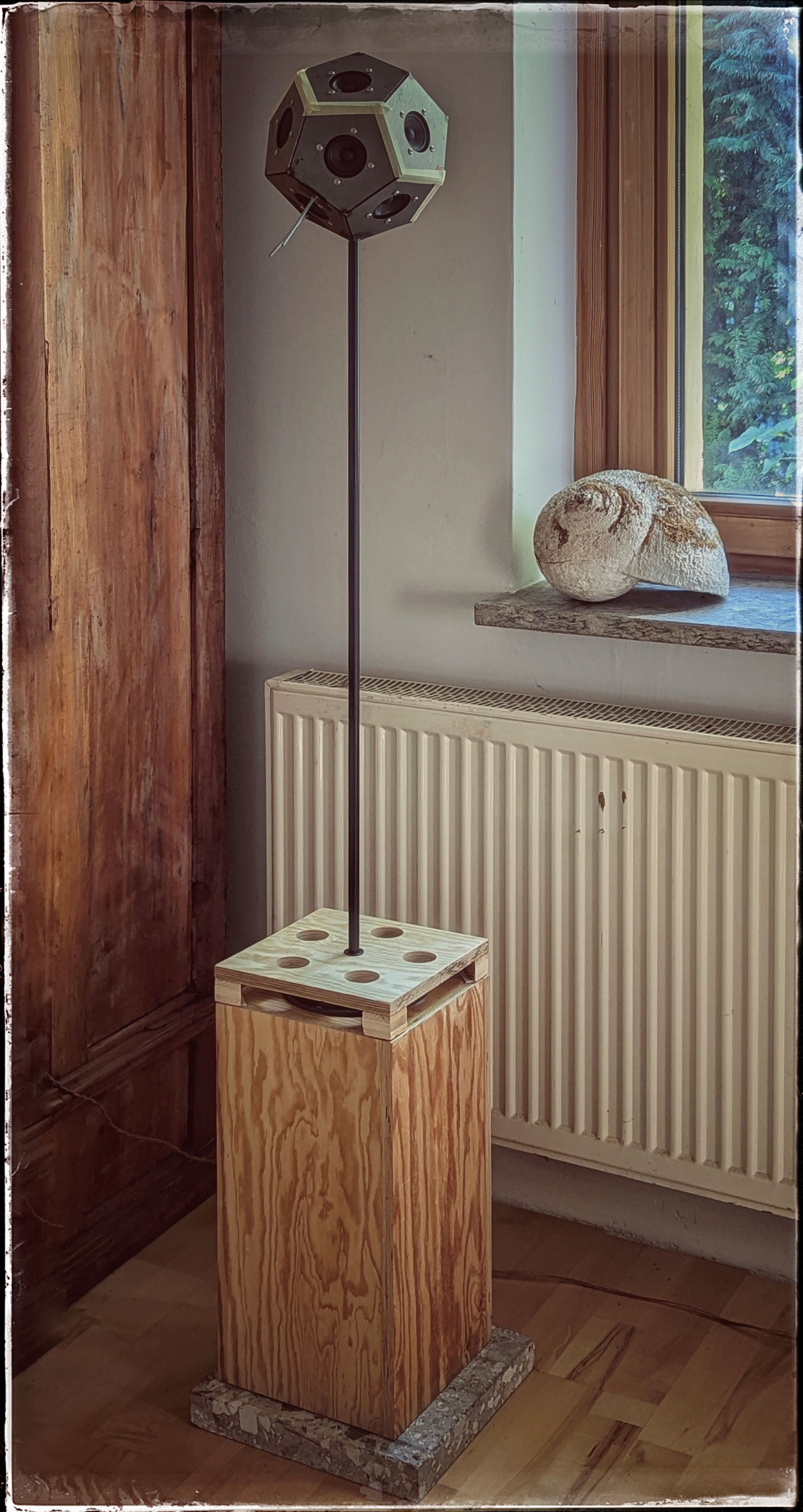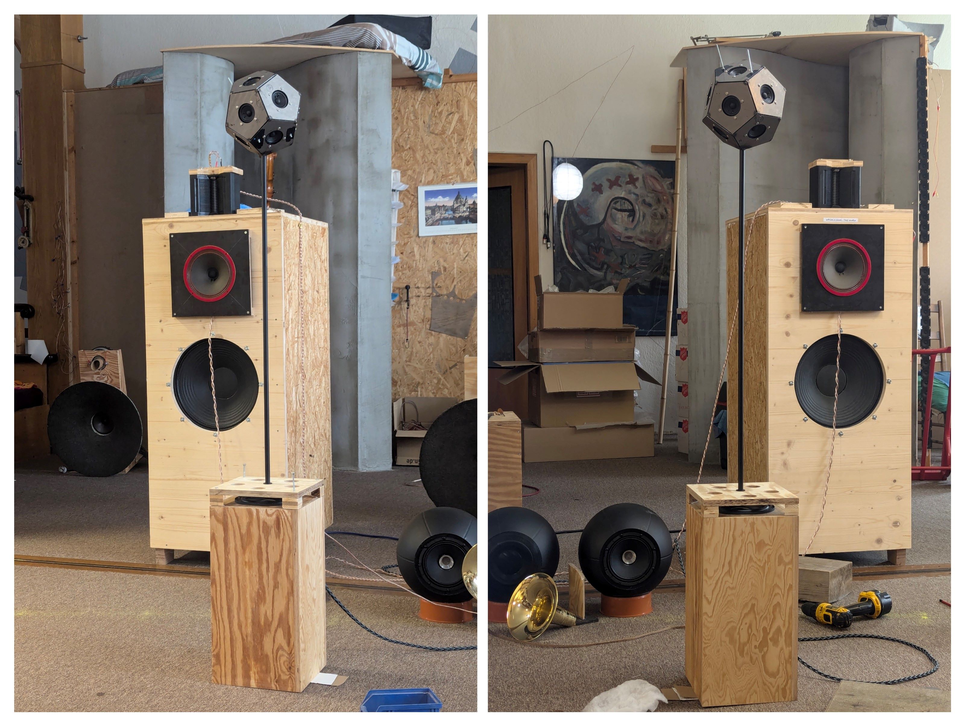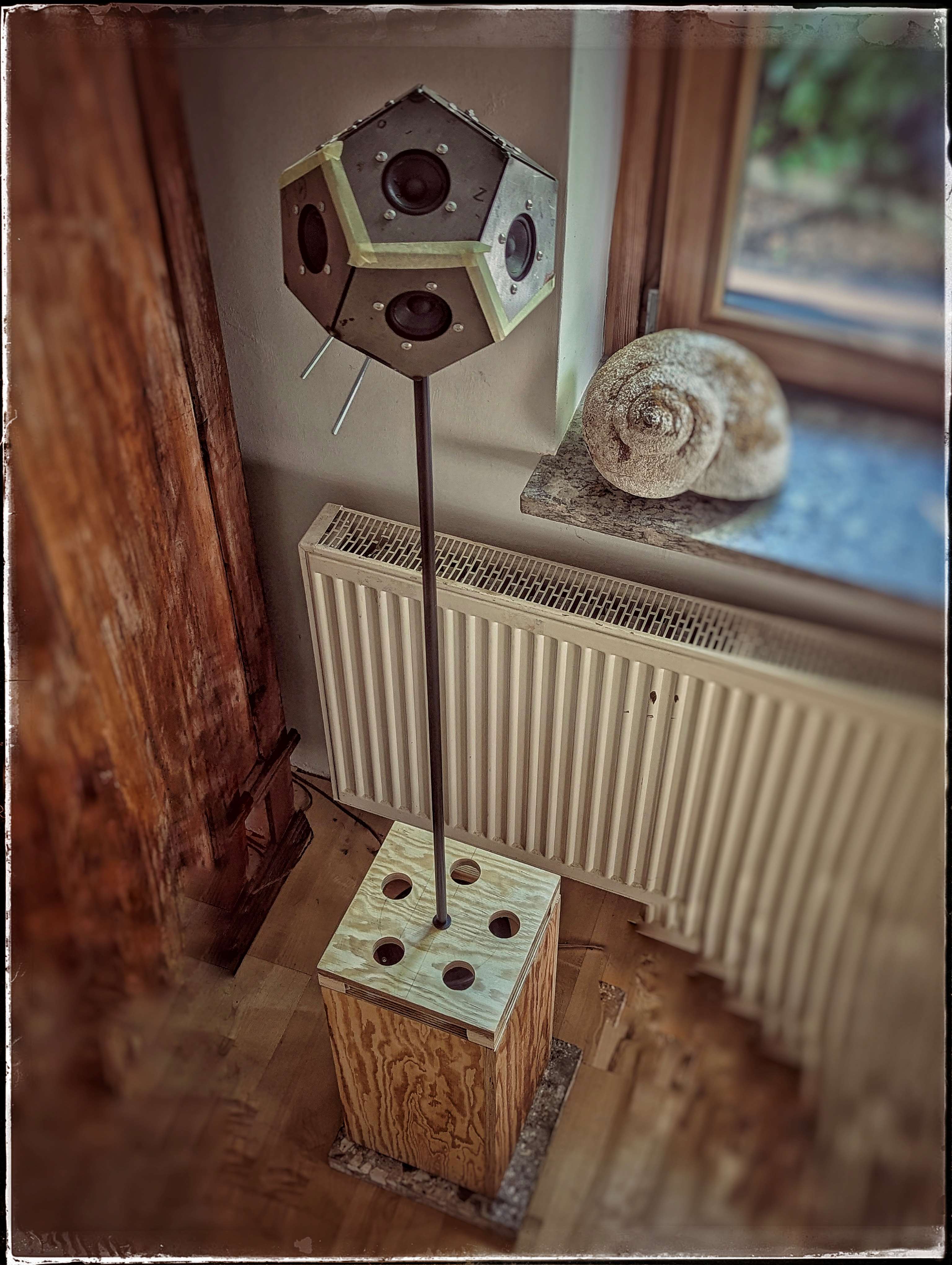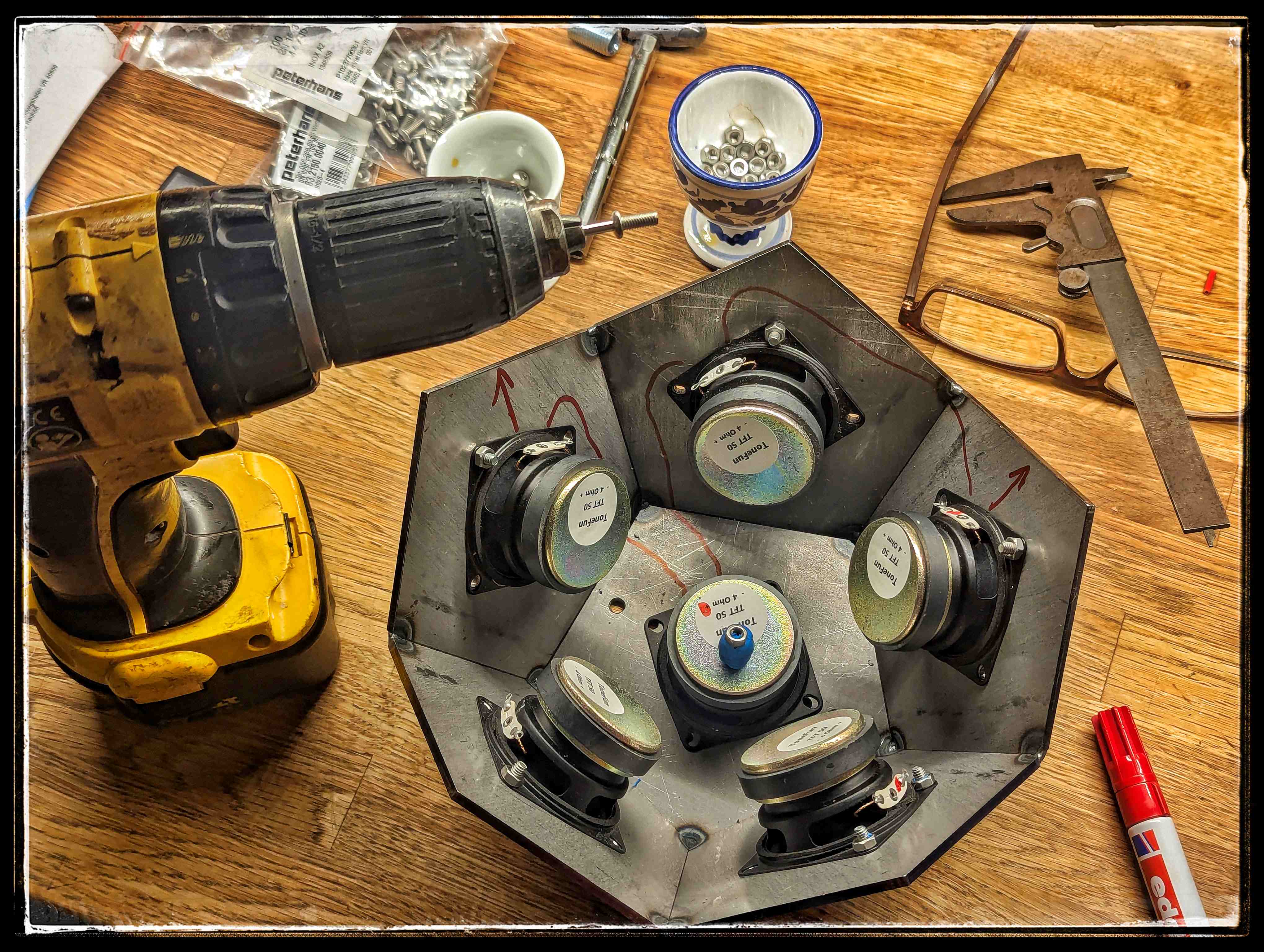 auch da geht es weiter, aber im Schneckentempo. Unerwartete Schwierigkeiten verhindern den schnellen Wurf. Schon das Anziehen der Muttern ist noch nicht gelöst. Ein kleiner Wulst an den Chassis verhindert, dass der Steckschlüssel sie bis zum Schluss greift. Eventuell schleife ich eine Seite des Sechskant weg? Den beiden Gewindestangen, die die Hälften zusammenhalten, ist ein Magnet im Weg. Die IKEA Lampe ist sehr fragil, die Dodekader sind sehr schwer. Die Sockel mit den Reckhorn-Bässen sind entlehnt von meinen (sechs besten) Radio FM Magnetostaten. Der Entwurf gefällt mir so weit. Es dauert alles. Bis die Frage nach der drahtlosen Bluetooth-Elektronik aktuell wird, fällt der erste Schnee....