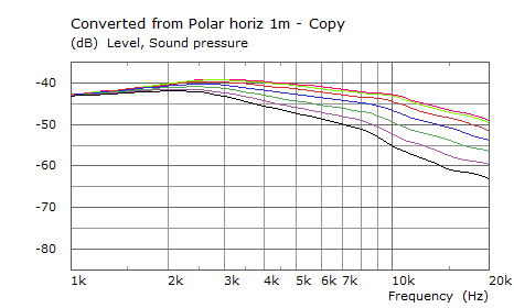 Das sieht wieder nicht so schlecht aus. Zumindest zwischen 3kHz und 13kHz recht gleichmäßig. Aber die sprungartige Verengung des Abstrahlverhaltens ist halt noch da, darüber verhält sich die Abstrahlung ähnlich wie beim ungekürzten Horn und zeigt dieselbe Aufwertung zu 20kHz hin.
