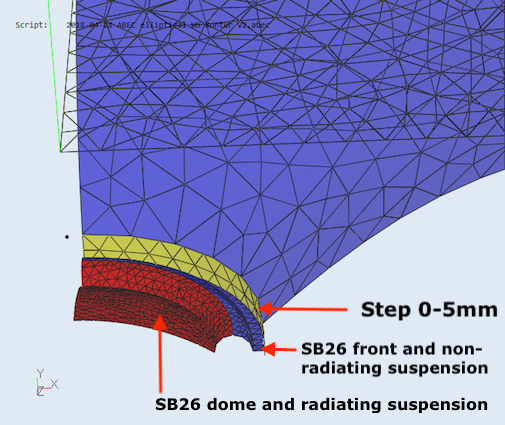 Die nächste Frage: Wie hoch muss der 'step' sein, um möglichst gut zu funktionieren? Daher die Simulationen der SB26ADC-Membran zusätzlich mit 1mm-, 3mm- und 5mm-Step. Tatsächlich hatte der 1mm-Step keine so gute Wirkung auf das Abstrahlverhalten, wie der 2mm-Step. Der 3mm-Step wirkte ich ebenfalls sehr positiv (vielleicht sogar etwas besser im Vergleich zum 2mm-Step) auf das horizontale Abstrahlverhalten aus. Bei 5mm wurde es schon wieder deutlich schlechter. Aha. Für diese Membran-Geometrie in dieser Schallführung scheint eine um 2-3mm zurückversetzte Membran am besten zu sein.