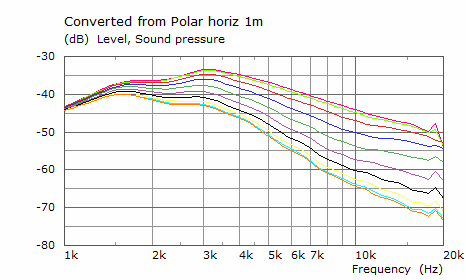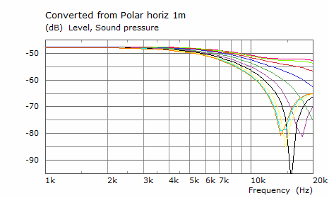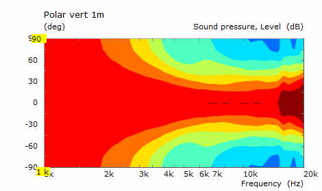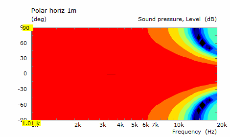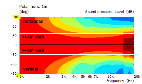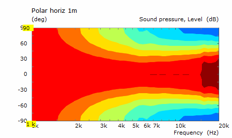 Aha. Ab 3kHz ist die Abstrahlung recht gut kontrolliert mit ca +/-30° bei -6dB. Darunter weitet die Abstrahlung langsam auf. Gar nich mal so übel. Aber - bei etwa 13kHz verengt sich die Abstrahlung plötzlich und weitet dann noch etwas auf ca +/- 10° auf. Die plötzliche Einschnürung passiert bei der heftigen Störung bei ca 13kHz: