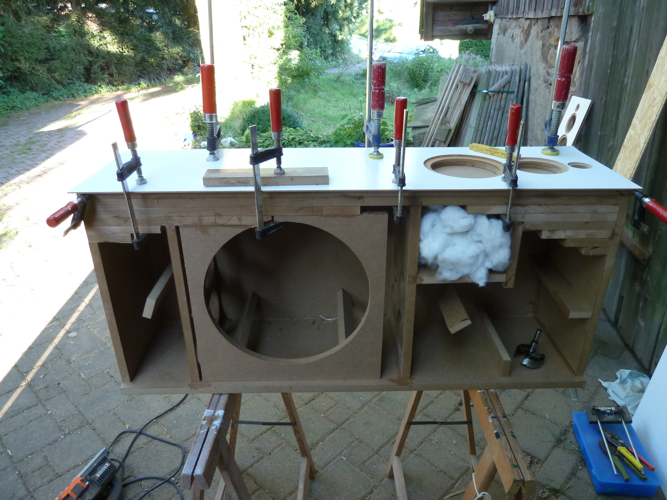 auf den bildern zu sehen sind die standboxen. oben und unten sind bretter geschichtet für die grossen phasen. oben die dickere und unten die schmalere. die rückkammer für den tmt mit dämmwolle. mt und ht wird direkt ins holz reingefräst da sie ja in der phase liegen.hab halt immer nur ab und zu mal einen halben tag weil ich immer sehr viel zutun hab. es ist halt "nur" ein hobby. näcchsten freitag nachmittag geht es auch wieder weiter. chassis einfräsen. seitenwand mit bass einsetzen. verkabeln und dann die phasen abschneiden. hoffe das klappt gut :D will es nun noch durchziehen bevor der herbst kommst und es kalt wird.