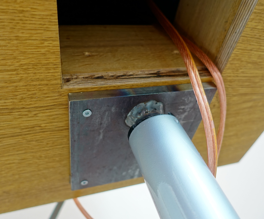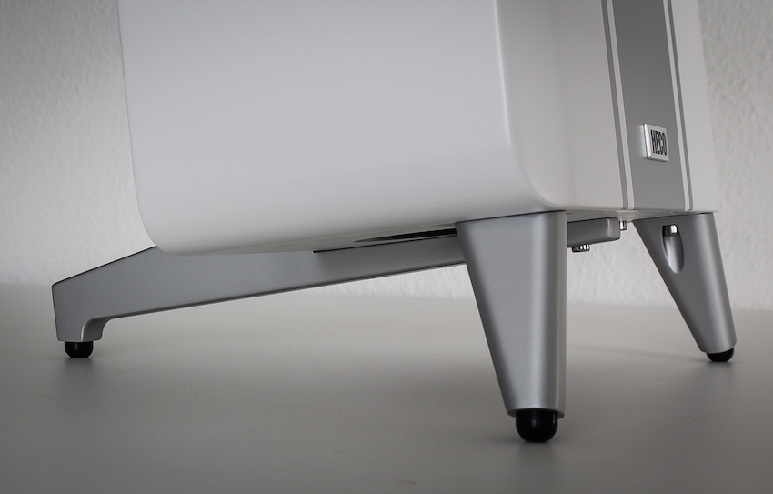 Diese steht auf drei Beinen mit einem längeren Ausleger nach hinten, alles aus verchromten Metall. Die Lautsprecher stehen damit absolut stabil und kippfrei.