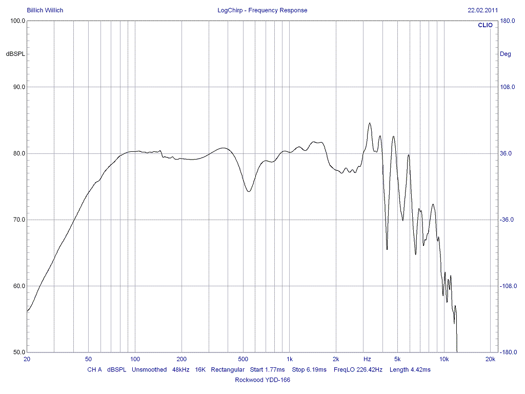 Die Amplitudenmessung ist einem Abstand von 60cm gemacht. Die Messung ist gefenstert, also ohne Raumeinfluss, Auflösung ca. 250Hz. Die Messung im Bassbereich wurde im Nahfeldmessung gemacht und per Merge-Funktion an die Fernfeldmessung angehängt. Der Verlauf bezieht sich natürlich auf das kleine geschlossene Gehäuse und ist nicht repräsentativ für ein etwaiges TQWT-Gehäuse.