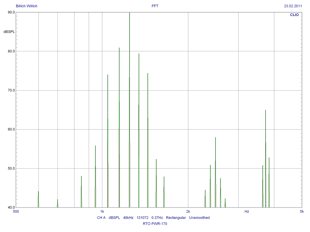Bei der Multitonmessung werde die Anregungsfrequenzen alle gleich laut eingespeist. Der Verlauf der Spitzen entspricht also dem Frequenzverlauf.