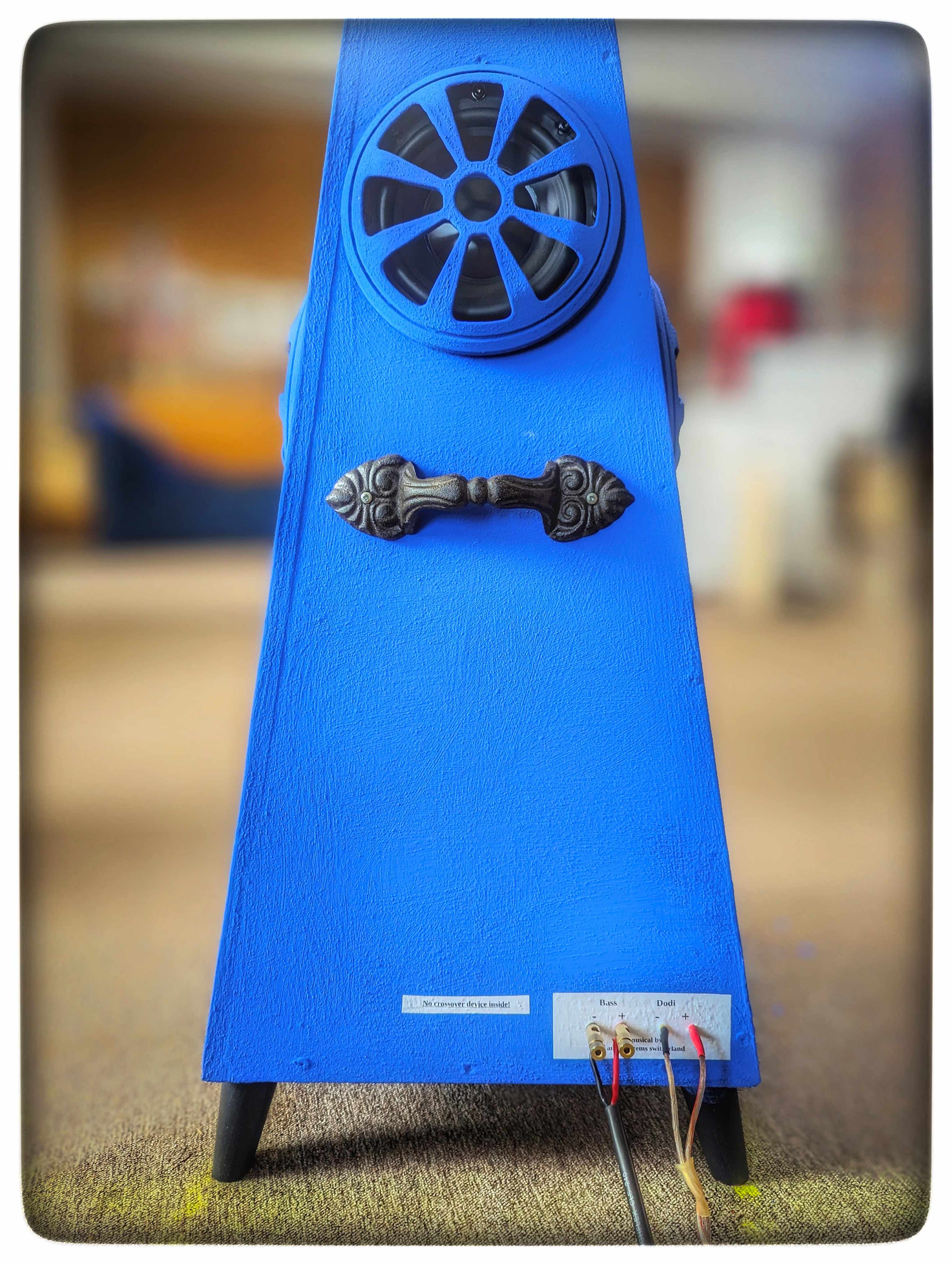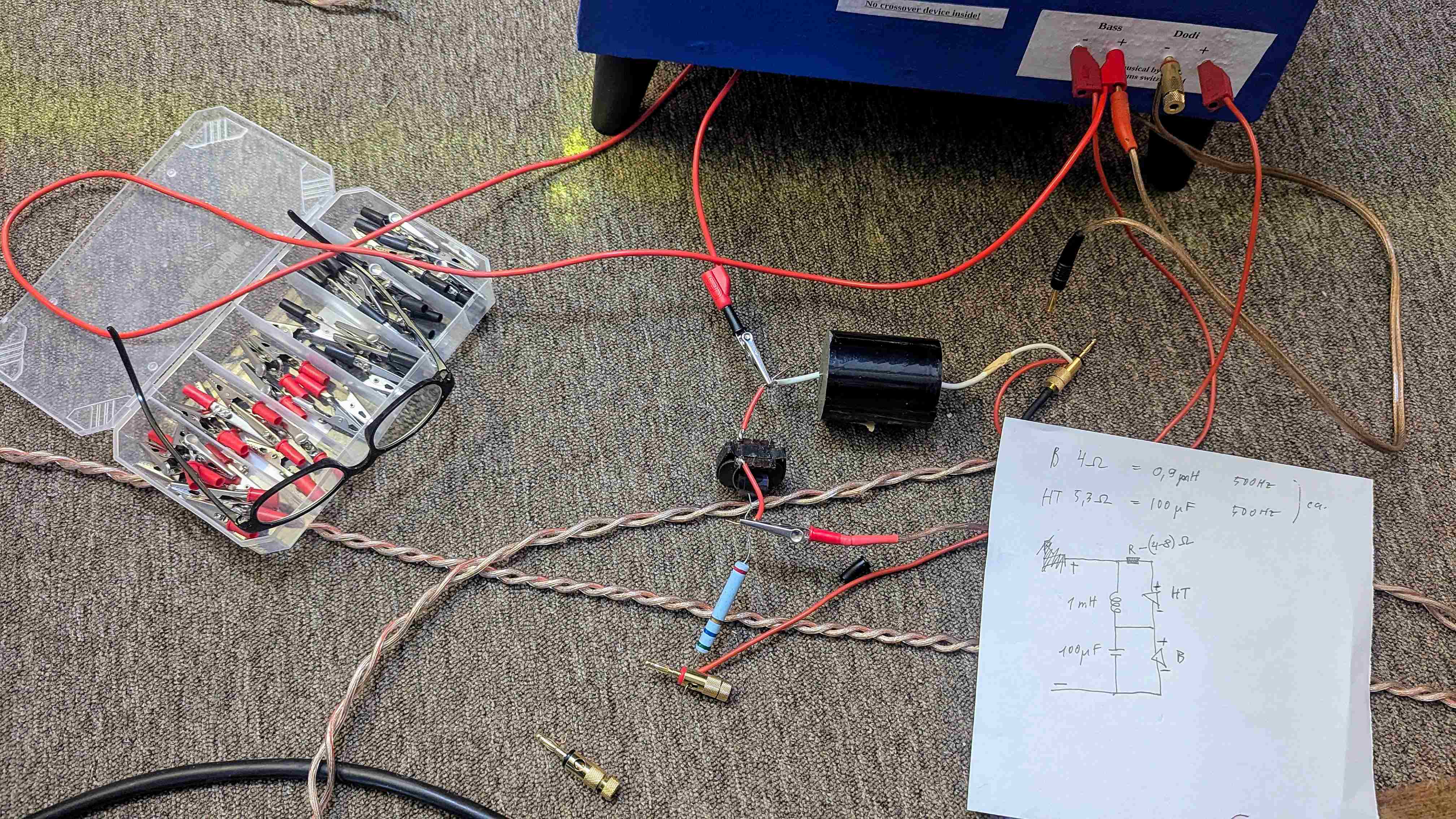Bevor ich es wage, hier und dann die Entwicklung eines vollständig kabellosen Betriebes meiner blauen Pyramiden anzustossen, klemmte ich eine aus drei Bauteilen bestehende Serienweiche zusammen. Bass und Mittelhochton scheinen sich sehr gutmütig zusammenzufügen. Mit einer "richtigen" Passivweiche wäre die Kabellosigkeit vielleicht auch etwas einfacher....