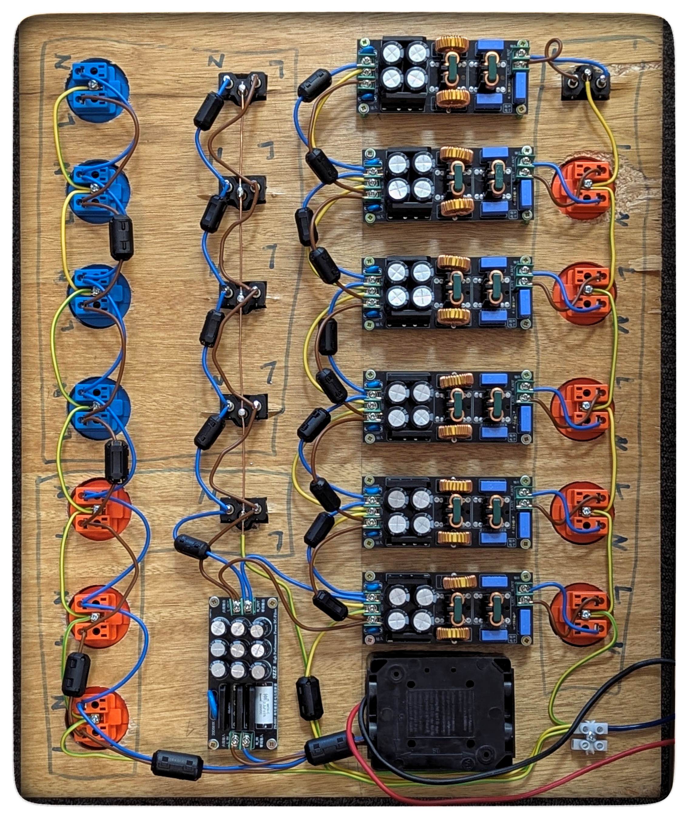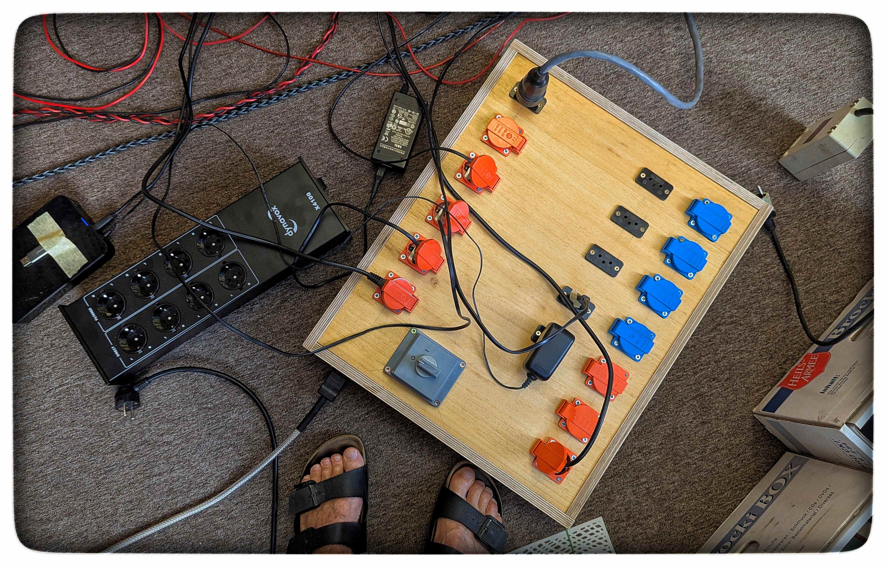 Ich hab die Hoffnung aufgegeben, noch zu meinen Lebzeiten meine beiden Pyramiden kabellos zu betreiben. Stattdessen verbessere ich generell meine Kabelsituation. Für HiFi gibt es jetzt eine separat abgesicherte Steckdose (da es in Werdau ( 23000 E) keinen einzigen Elektriker gibt, selber genagelt). Ein geschirmtes Kabel führt zur Dynavox Leiste und zu einer selber gezimmerten Verteilerbox mit DC und EMI Filter, deutschen und Schweizer Steckdosen. Ferner werden alle Geräte phasenrichtig eingestöpselt.