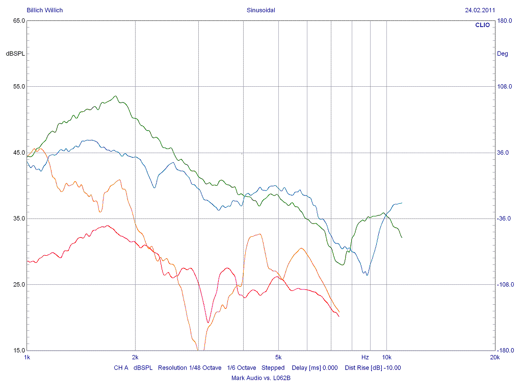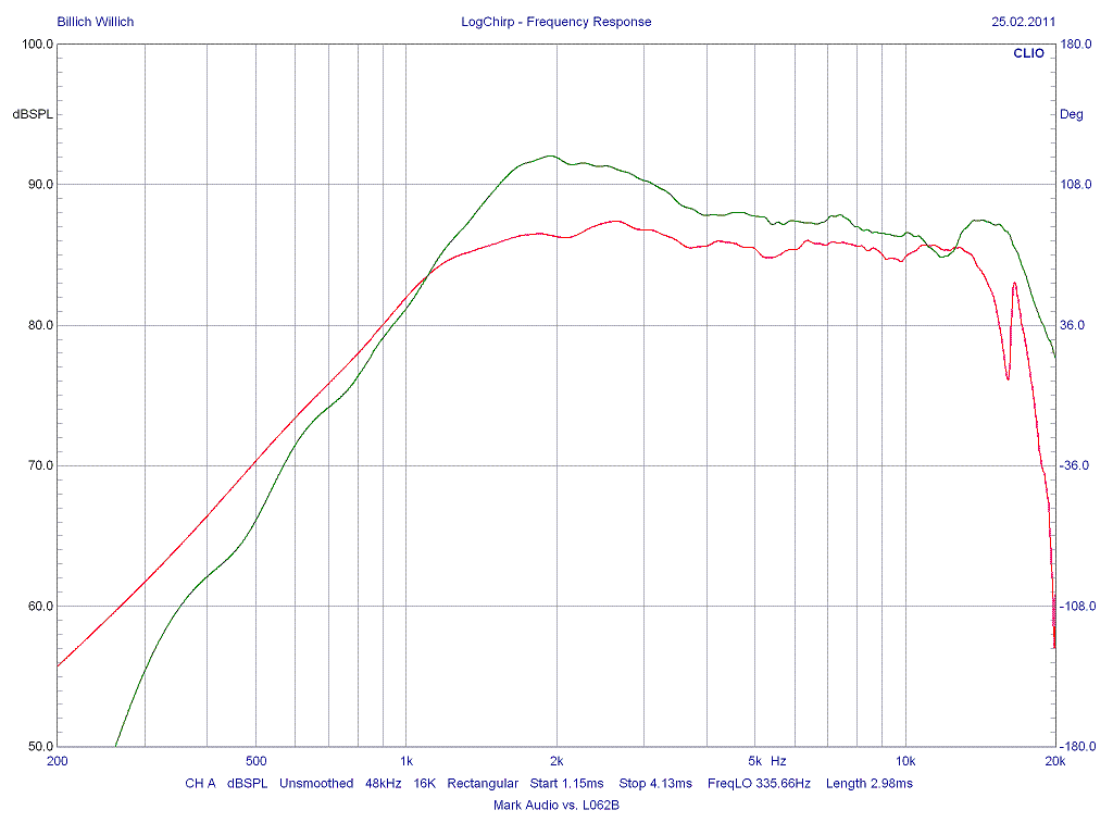 Der Mark Audio ist etwas lauter. Die Linearität ist bei beiden aber ausgezeichnet. Der Anstieg des MA zu tiefen Frequenzen kann man leicht mit der Weiche kompensieren. Er spart sogar noch Geld, weil der Serienkondensator eine Nummer kleiner ausfallen.