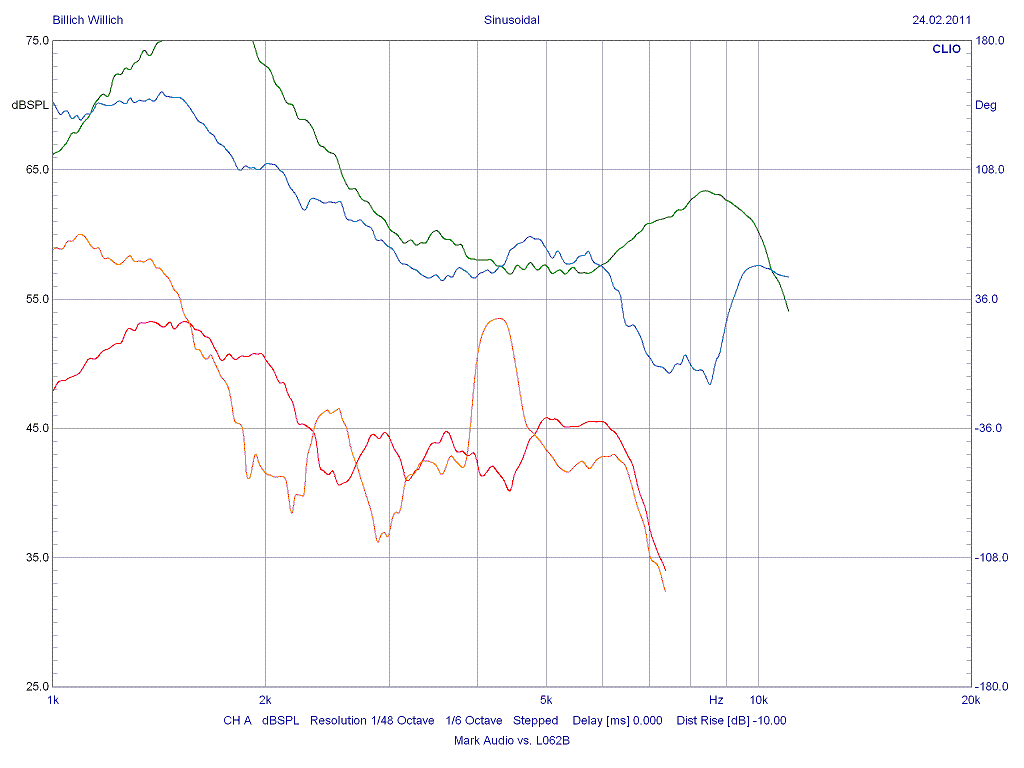 Um 16kHz sieht man beim L062B die Reflektion am Polkern, was auf fehlendes Dämpfungsmaterial hindeutet. Leider ist die Schwingeinheit verklebt, ansonsten wäre ein Modding ein Versuch wert.