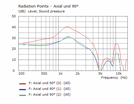 Zunächst für die Kalotte. Der Frequenzgang bei 0° axial (rot), 90° (blau) und ca 80° (grün):