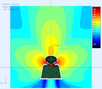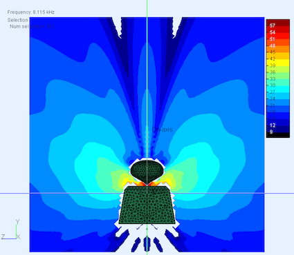 Wie zu sehen, ist der Reflektor relativ weit entfernt von der Membran plaziert. Später auch Simulationen mit näher an die Membran plazierten Reflektor, d.h. eher einem Gehäuse-Reflektor-Waveguide.