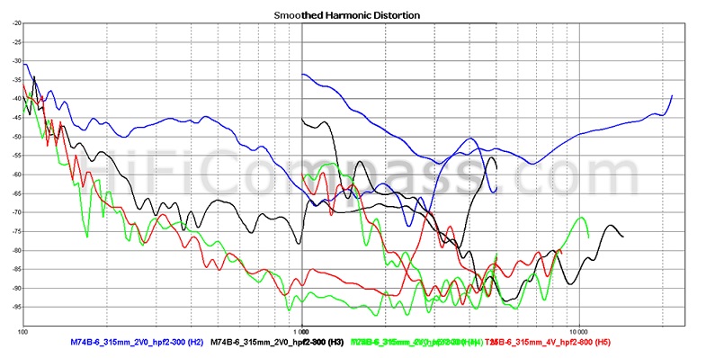 Dass die 1" Bliesmas bei 2 kHz noch nicht trennbar wären ist auch nicht nachvollziehbar. Bei der max. Spannung, die HiFiCompass angelegt hat, 11V = ~105 dB produziert der/die/das T25A -60 dB = 0,1% K3. Das ist nun noch ohne Hochpass; welcher nicht nur unter, sondern auch an seiner Eckfrequenz dämpft, und in dem Bereich die Verzerrungen weiter reduziert. Um das Verzerrungsniveau zudem einzuordnen / in den relevanten Kontext zu setzen: beim gleichen Pegel produziert die Mitteltonkalotte M74 im ganzen sinnvollen Übertragungsband nicht, oder nur minimal weniger.