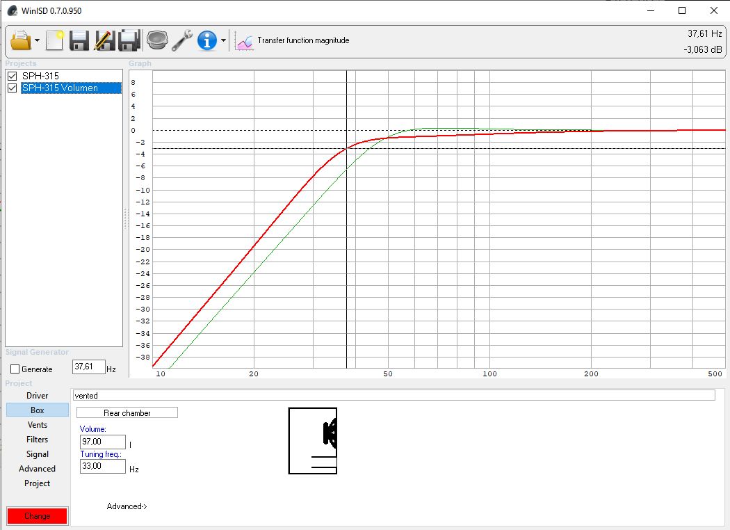 Dann habe ich, bei gleichbleibenden Port Maßen, das Volumen so lange vergrößert bis das Tuning bei 33Hz (wie gemessen) liegt: