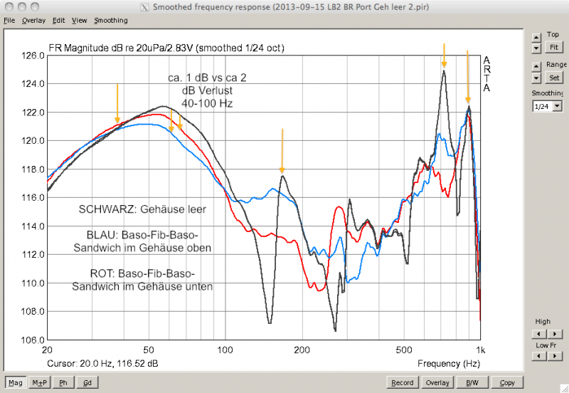 Daher habe ich unterschiedliche Materialien in 28 cm Abstand vom Gehäusedeckel plaziert und am BR-Port gemessen. Hier im Vergleich zur Messung mit dem bereits angebrachten Baso-Fib-Sandwich am Gehäuseboden:
