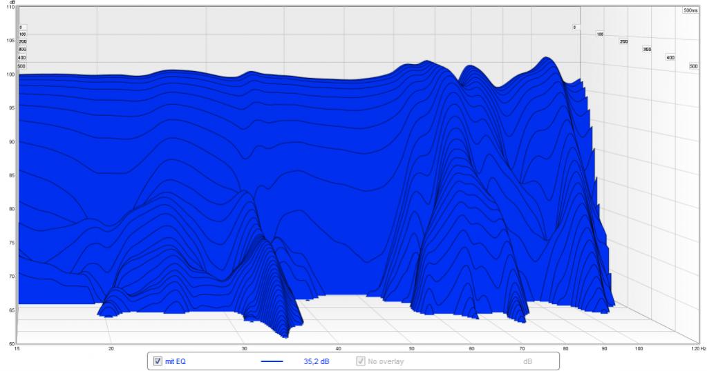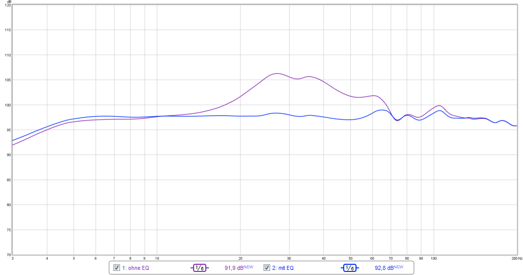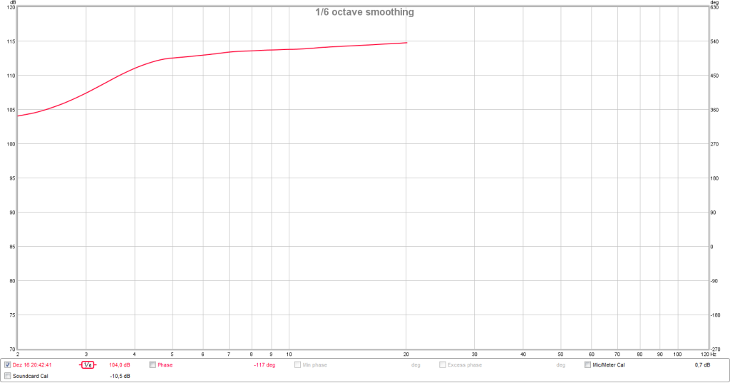 Dafür gibt es hier die erste Messung in der Raummitte. Ein bisschen ist wahrscheinlich noch drin, so dass die erwarteten 115 dB bei 4 Hz nicht unrealistisch sind. :)