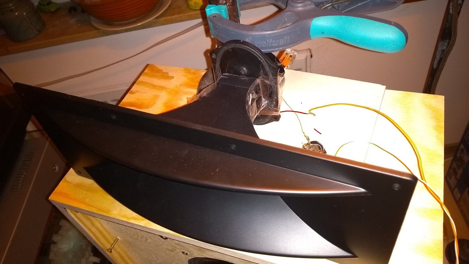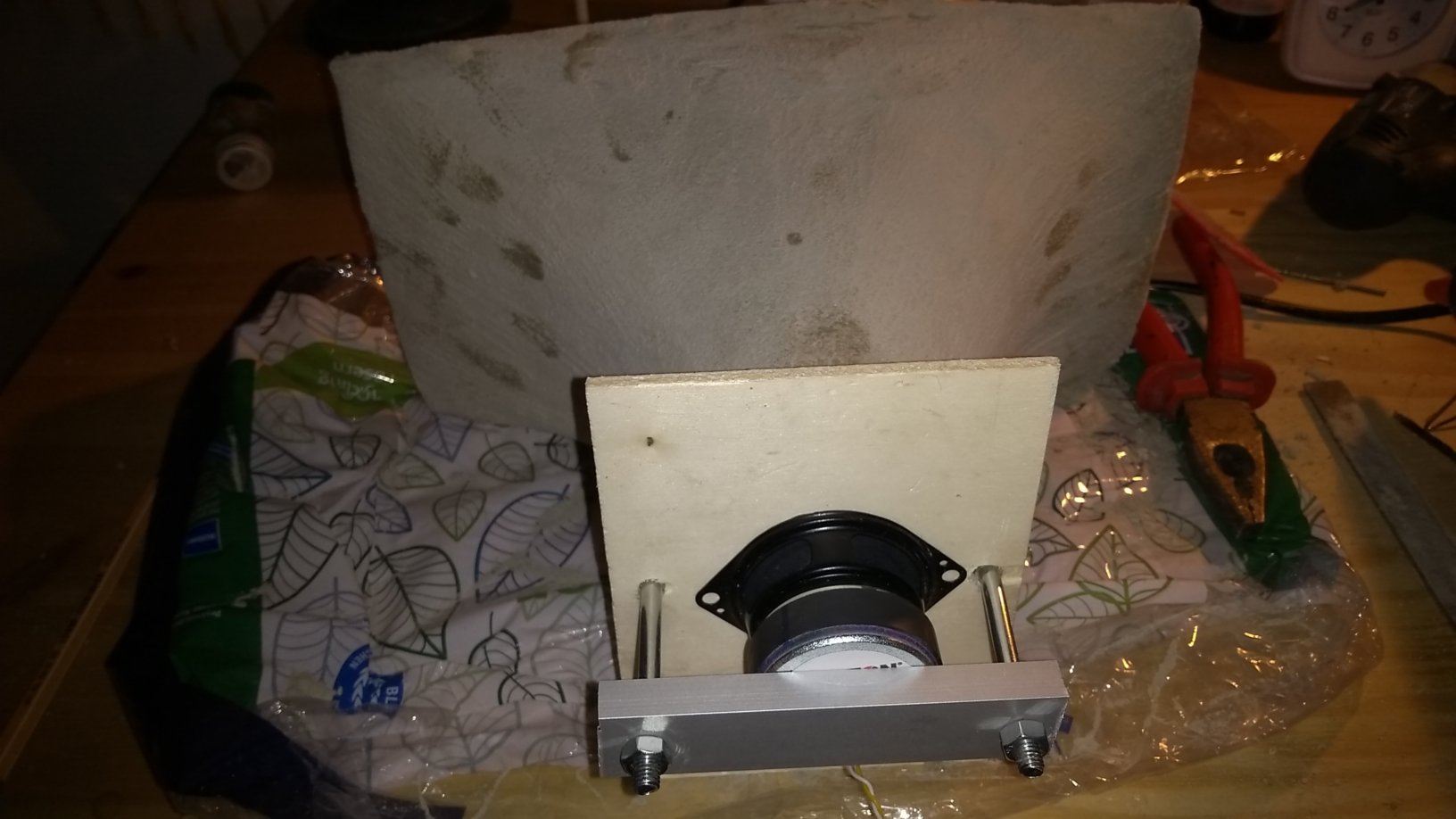 so eine Klemm-Halterung spart eine Menge Klebeband und als ich heute die Zweite gebaut habe, dachte ich mir: Der Visaton FRS5X ist zwar zu groß für das 1" Bell-Horn, aber mal sehen was passiert.