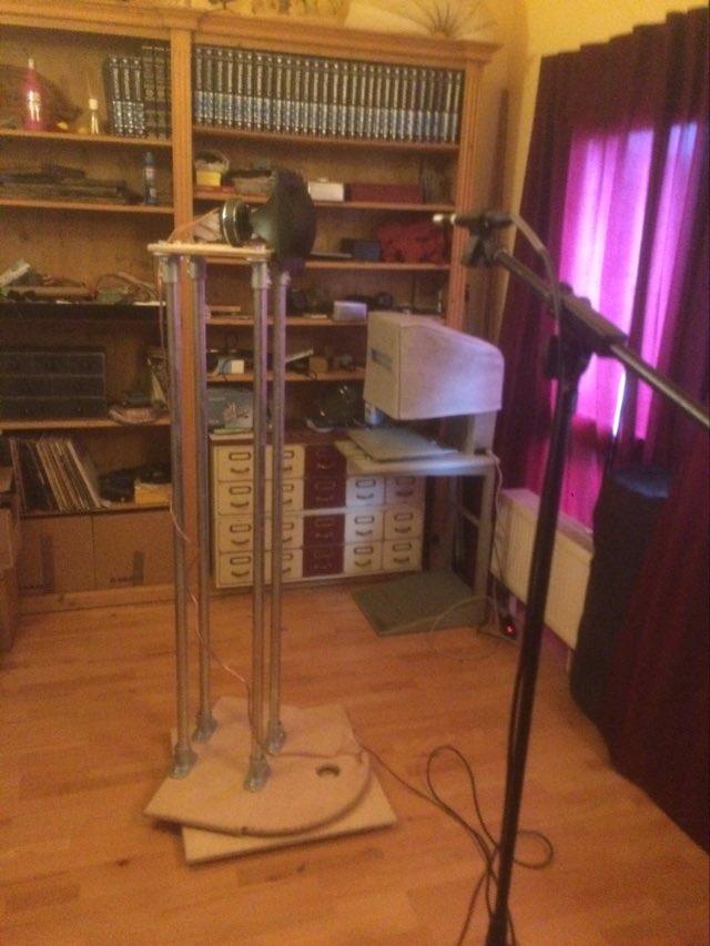 Das Mikrophon war pegelkalibriert, jedoch habe ich nicht 2,83 Volt oder auch 1 Watt draufgegeben, es war eher hohe Zimmerlautstärke, halt so, dass mir gerade kein Blut aus den Ohren zu laufen drohte. Das Mikrophon war 1 m vom Horn entfernt. Die Hornvorderkante stand etwa 3 cm über dem Drehpunkt der Drehkonstruktion hinaus.