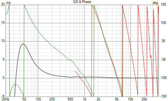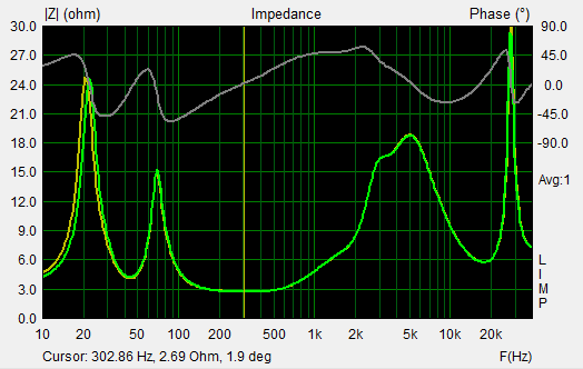 Das Impedanzminimum liegt wie simuliert bei recht niedrigen 2,7 Ohm @300z, allerdings mit kaum Phasendrehung (rein Ohmsche Last). Trotzdem eher ne Box für modernere Class A/B oder Digitalamps, die lieber Strom als Spannung liefern - weniger was für Röhrenverstärker....