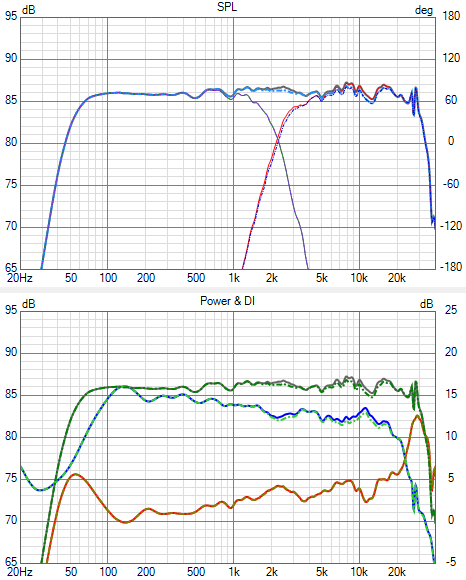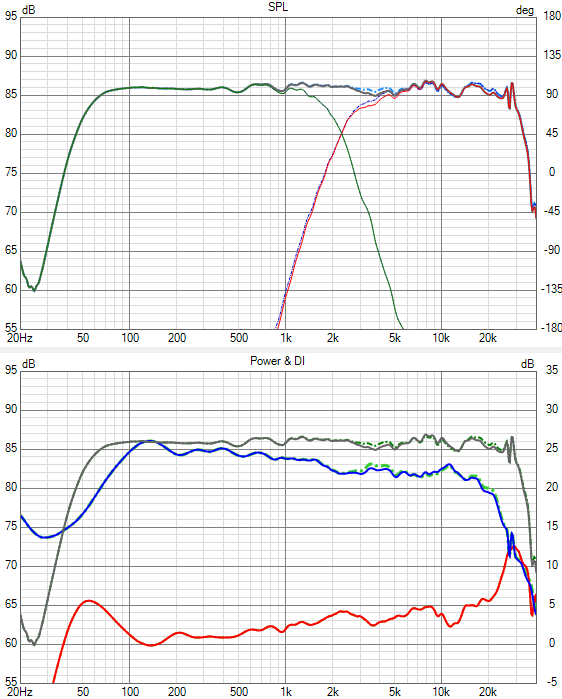 Power Response und DI nur hor +/-60°, nur ver +/-40° (beide gestrichelt) und hor+ver zusammen: