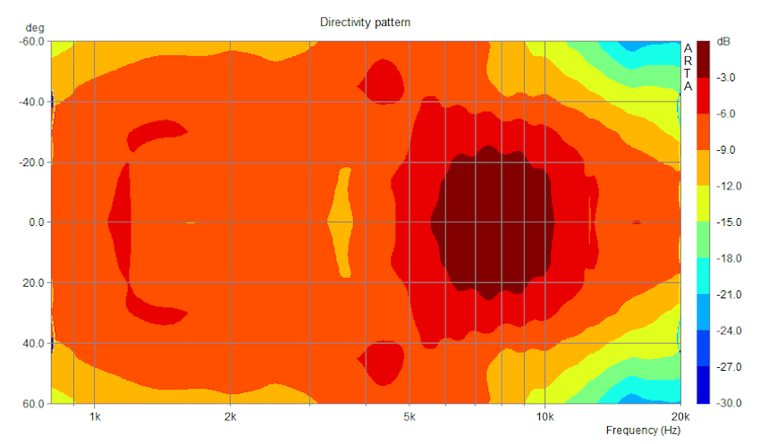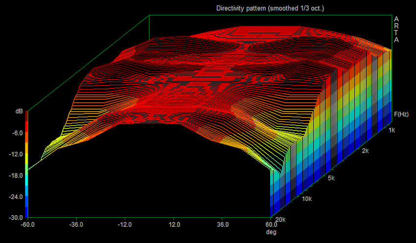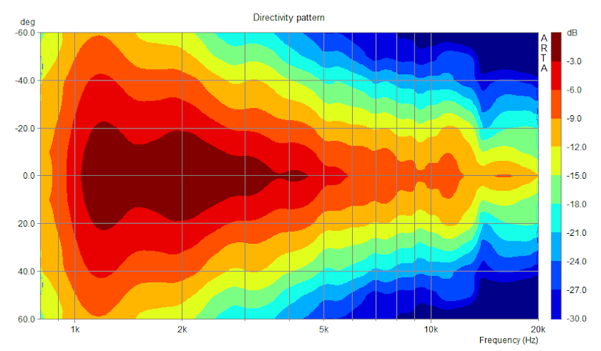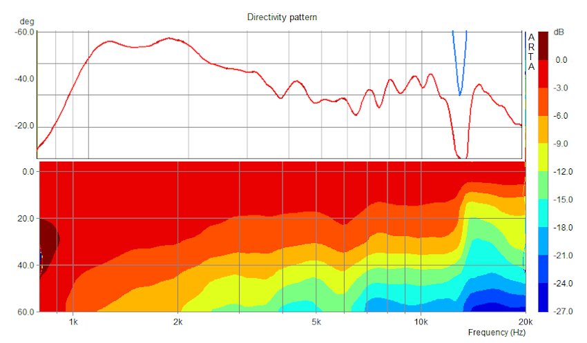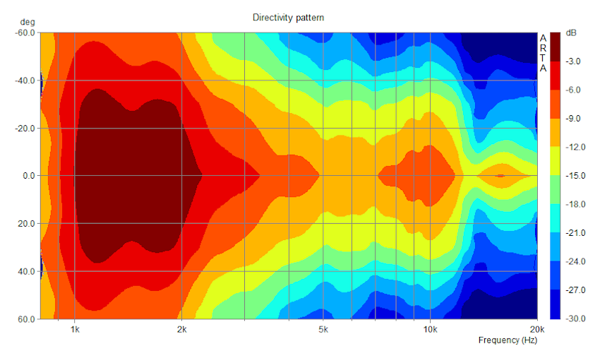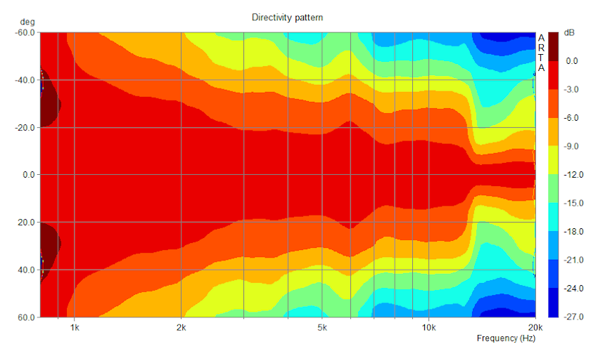 Aha. Ab 3kHz ist die Abstrahlung recht gut kontrolliert mit ca +/-30° bei -6dB. Darunter weitet die Abstrahlung langsam auf. Gar nich mal so übel. Aber - bei etwa 13kHz verengt sich die Abstrahlung plötzlich und weitet dann noch etwas auf ca +/- 10° auf. Die plötzliche Einschnürung passiert bei der heftigen Störung bei ca 13kHz: