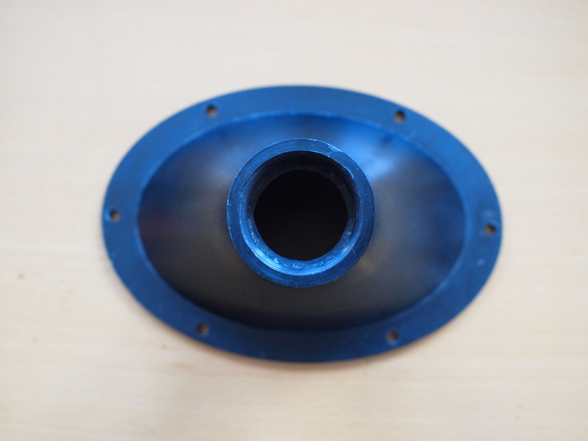 Also weiter im Text. Wie lässt sich das Horn für den Einsatz mit der inversen Kalotte anpassen? Klar, den langen Hals (mit innenliegendem Gewinde) des Horns kürzen, zunächst um 13mm. :built:So bleiben 4mm des Schraubgewindes stehen (Innendurchmesser 34mm), dann kommt die stufenartige Verengung auf 29mm (= Beginn der Hornkontur). Ich habe die 4mm noch stehen lassen, um in einem weiteren Schritt die noch bestehende Stufe auf 29mm Innendurchmesser verbunden zu können. Dazu später mehr...