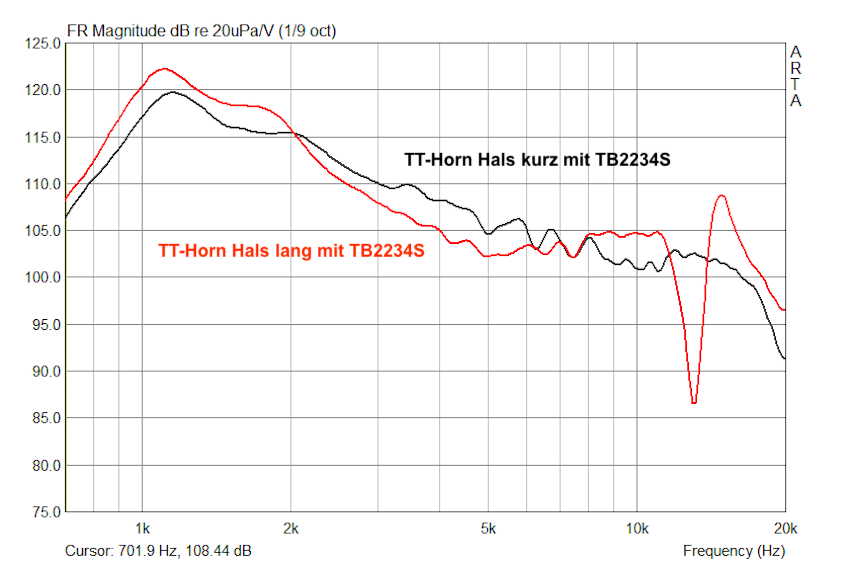 Da ist was passiert - die Störung bei 13 kHz ist fast weg. Im Vergleich die Messung des Horns mit langem Hals (ebenfalls direkt am Hornmund):